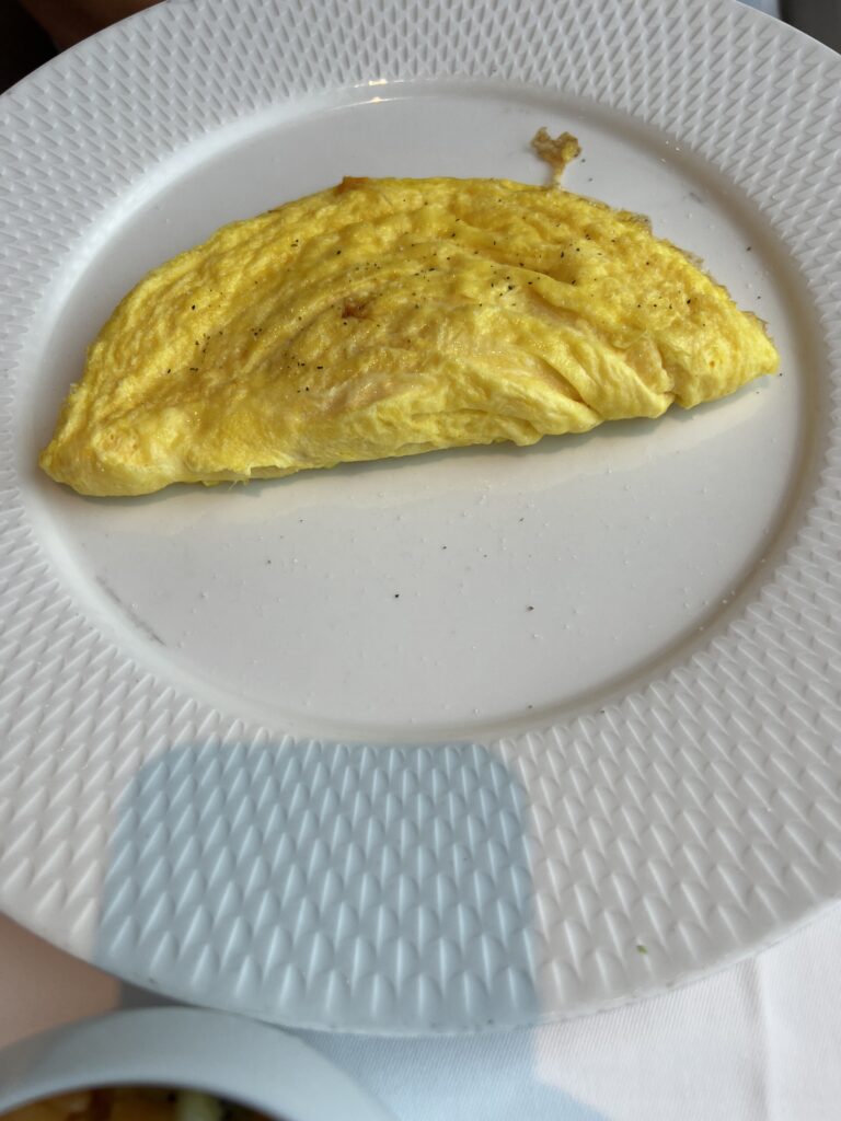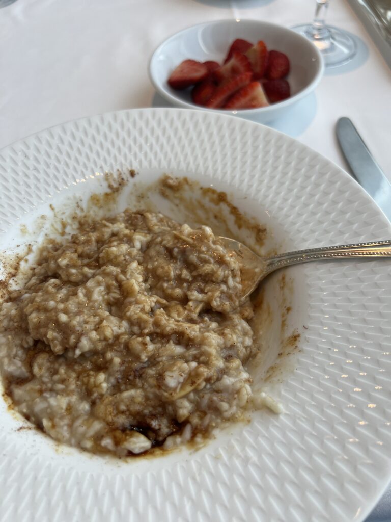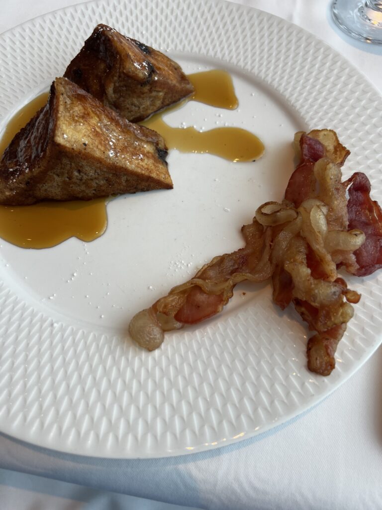 Lane had oatmeal and bowl of fresh berries. Running out of berries on the ship so it turned into a bowl of strawberries. Also tried out the French Toast with bacon. No complaints — good stuff. Can tell it is time for an injection