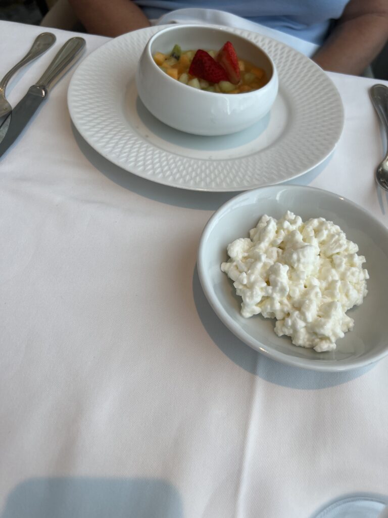 Jackie had fruit salad, cottage cheese and a cheese omelet for her breakfast