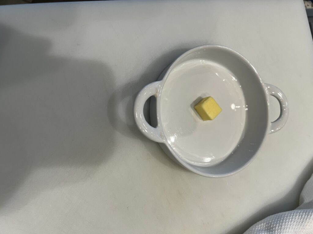 We coat a small plating dish with butter. Used fingers to melt down the butter and coat the dish.
