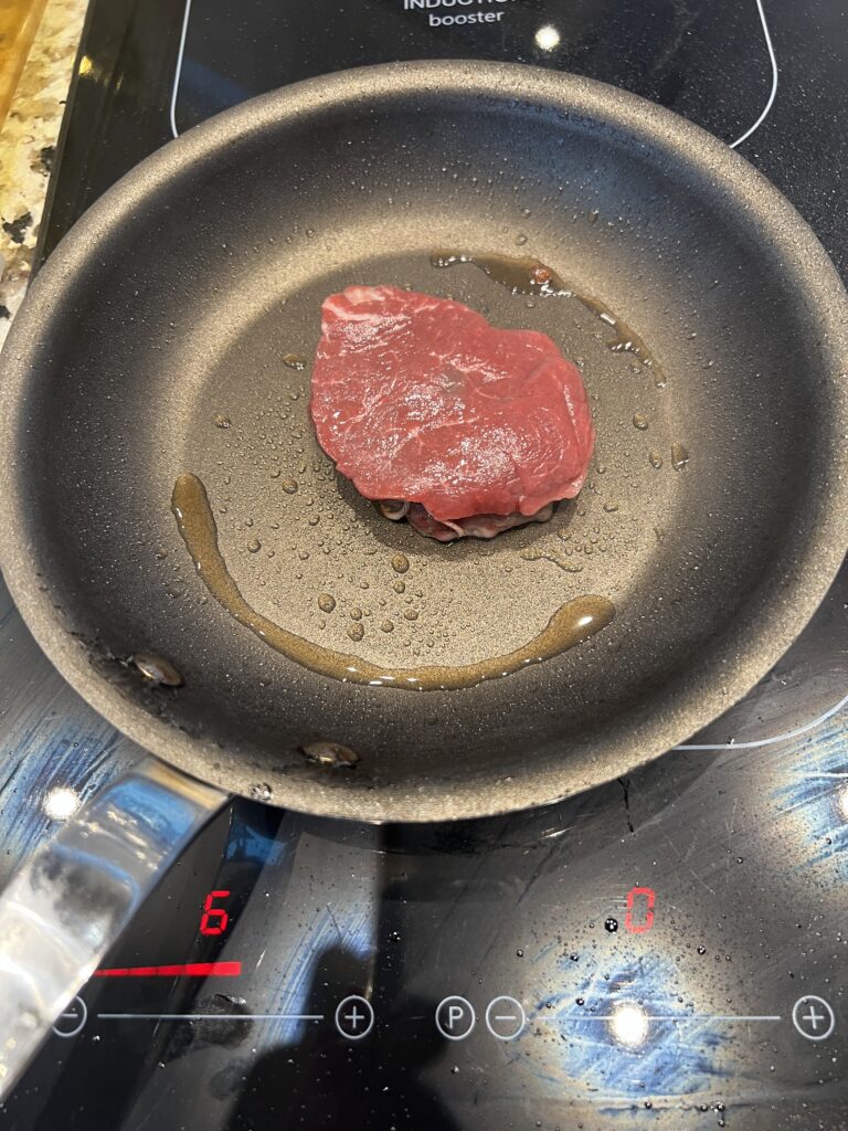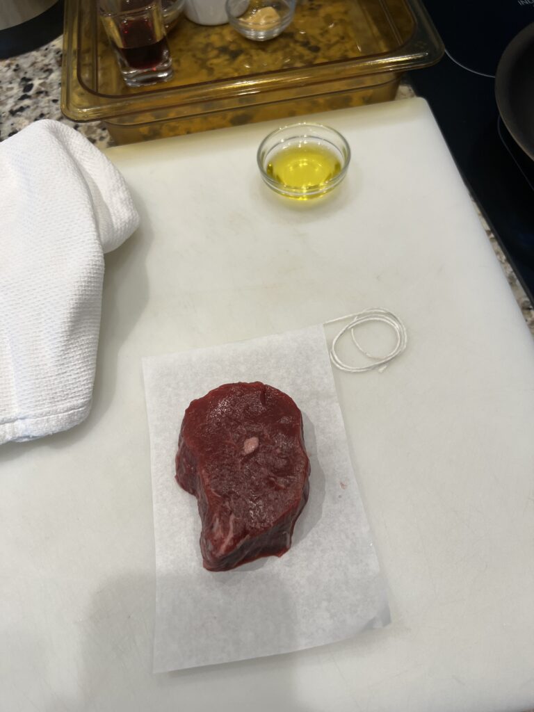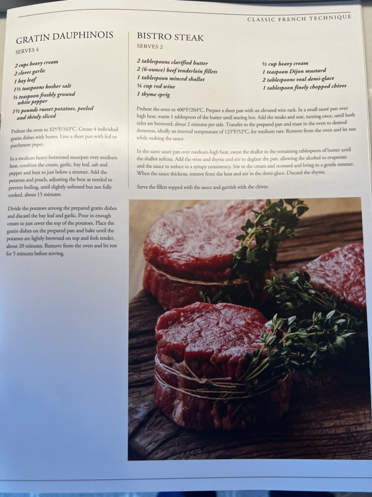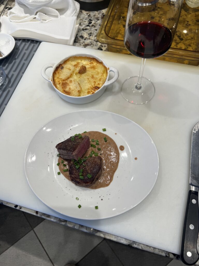Finished dishes of potatoes au gratin and a filet. Both were good stuff