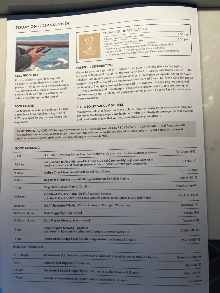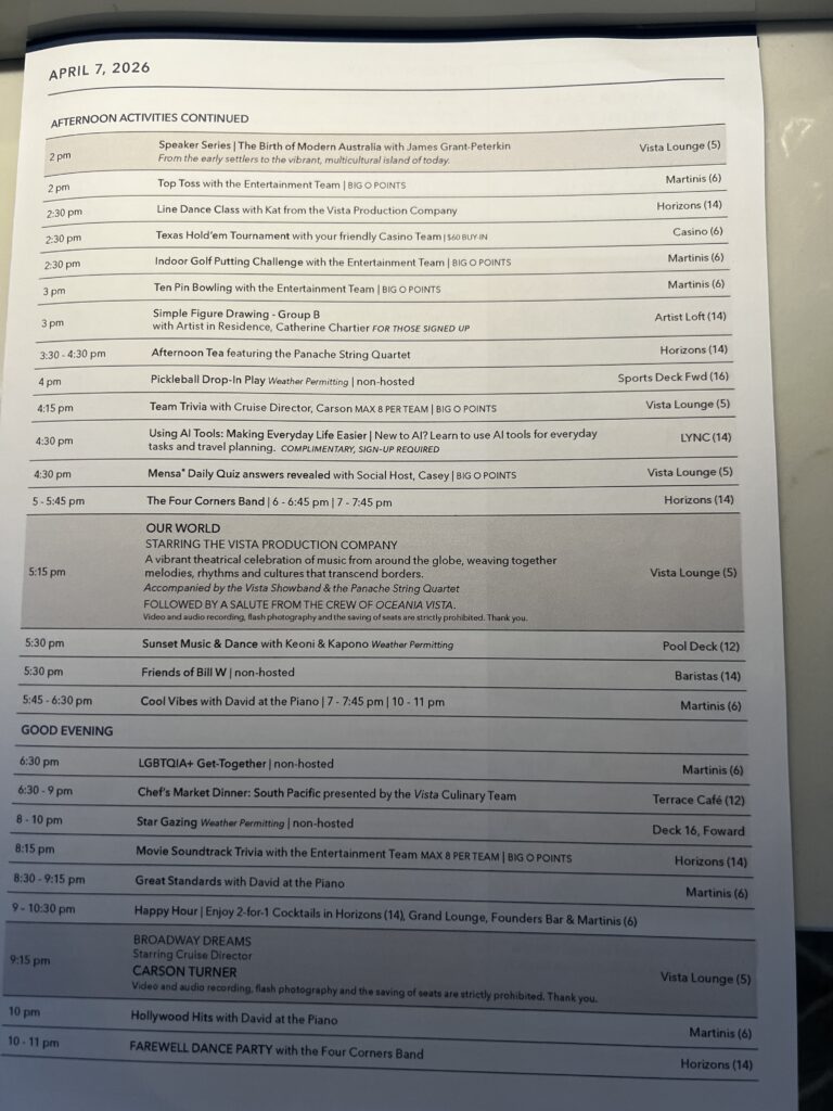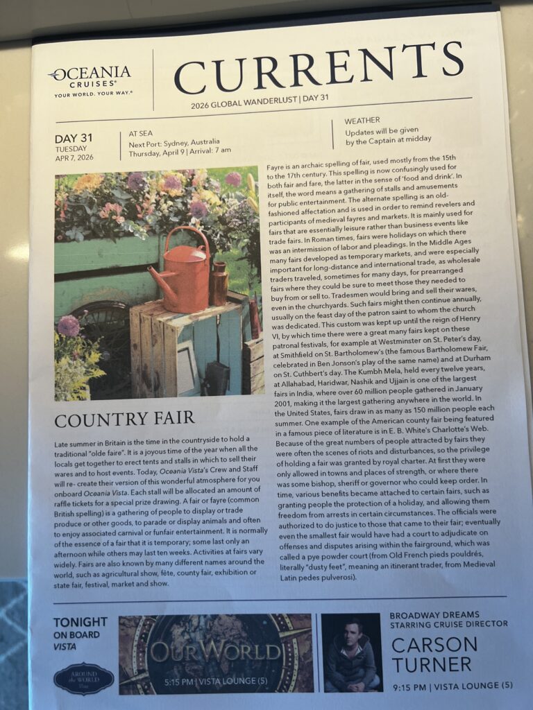 Day 32 Tuesday April 7th (88 days to go) — We had a sea day which was appreciated after stops at Mystery Island and Noumea, New Caledonia. We did not have much on the schedule but attended a cooking class and then had dinner at Red Ginger in the evening. There was a country fair on the pool deck but we missed it as we were in the cooking class. We will make a county fair one day before getting off the ship. I think we will have 3-4 more chances to attend.