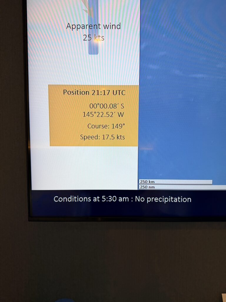 We crossed the equator today and I will post the photos that I posted earlier today on Facebook. Watching the map on TV was like watching a New Years Eve countdown as we waited for the zero degrees to appear.
