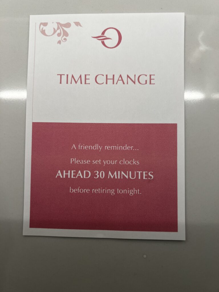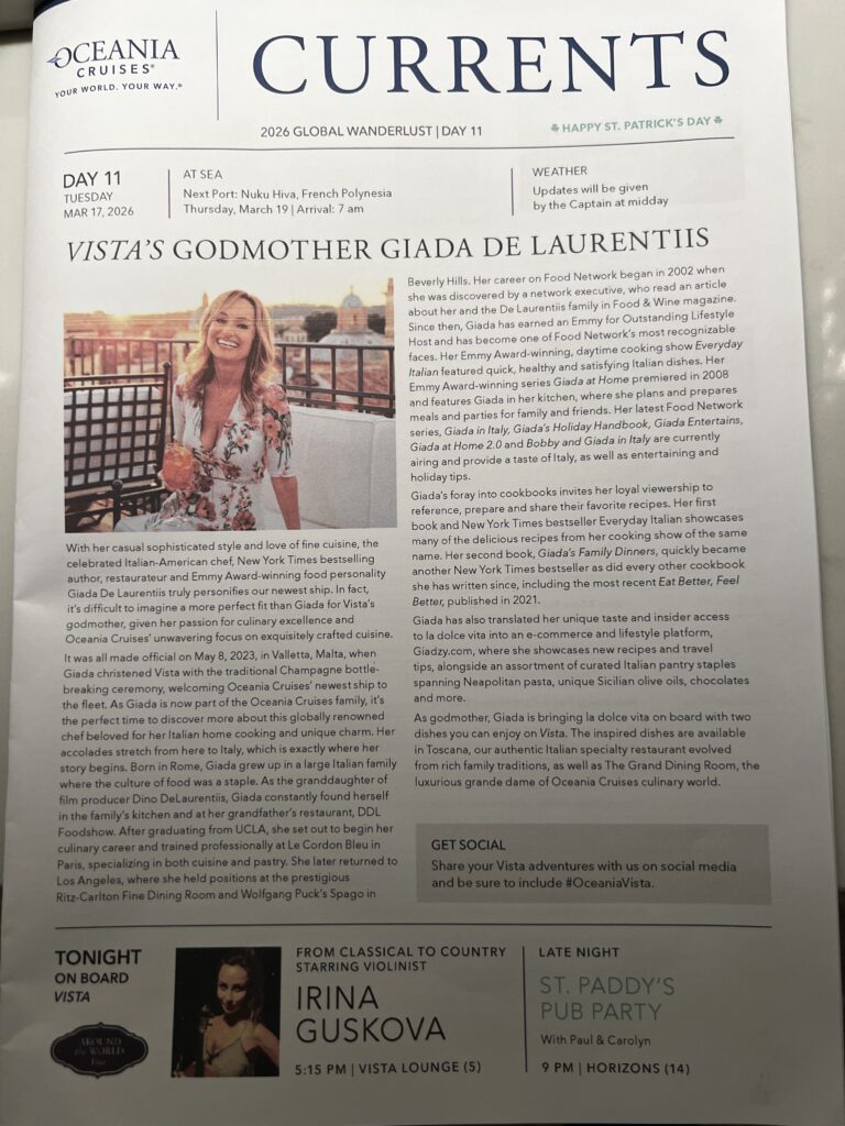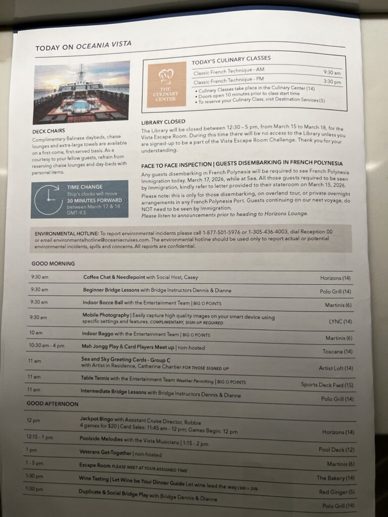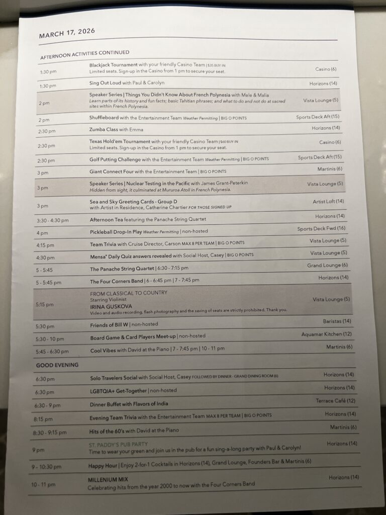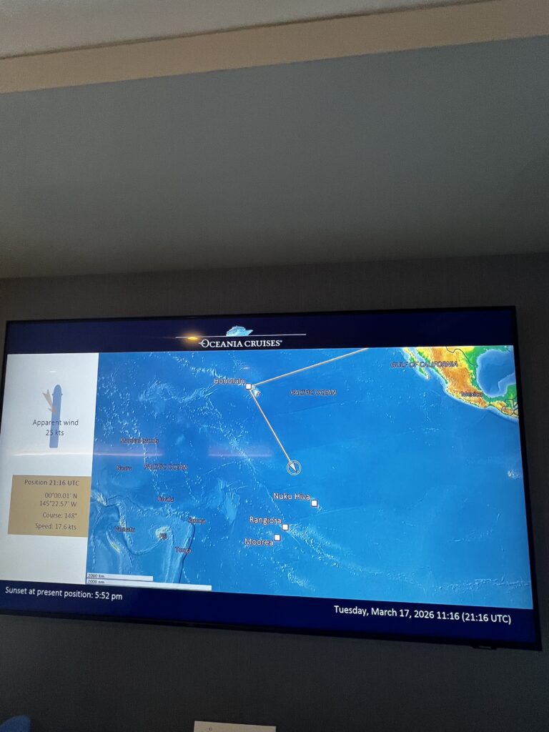 Day 11 Tuesday March 17th – a new type of day as we did not attend any classes or speaker’s series today. We woke up, skipped breakfast and hung around for a little waiting to meet with French Polynesian authorities in advance of our arrival into Nuku Hiva on Thursday. We were supposed to meet at 11:15am but an announcement was made that they were running behind schedule. So, we had lunch (hamburger and hot dog) and came back to the cabin when we heard our names overhead to report to the Horizons Lounge. We were famous and also the last passengers to meet for our visas. Hey, if you not first, you are last. 🙂