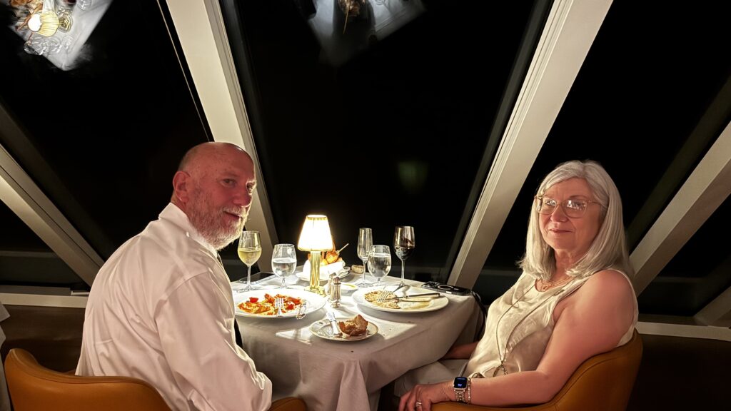 Tomorrow is a ceremony for those passengers (like us) who have never crossed the equator by sea. It should be fun. Starting off the few photos of today with actually a photo taken by David Chen of Jackie and I at Toscano’s.