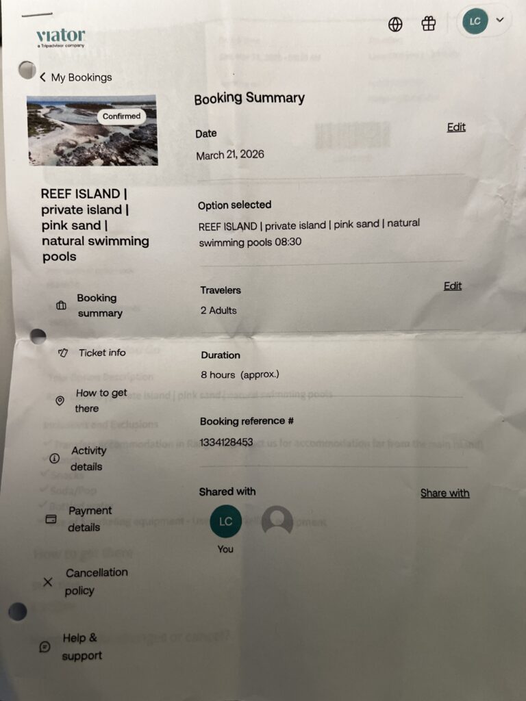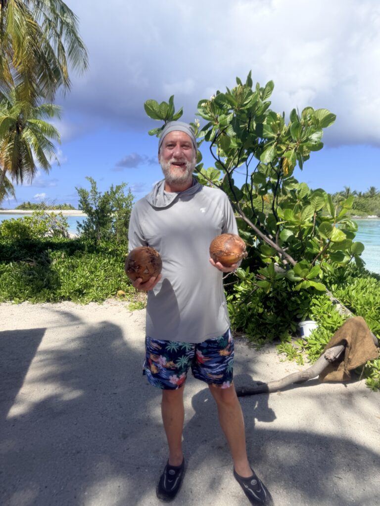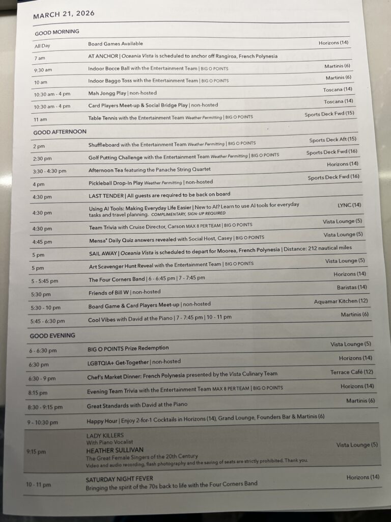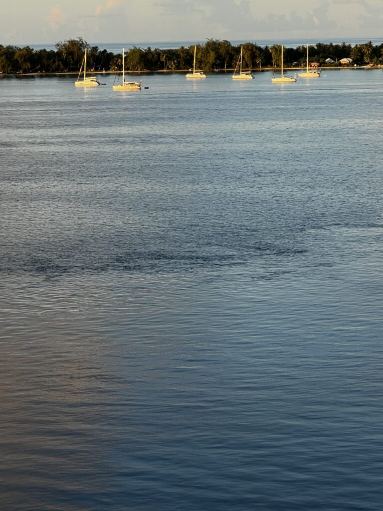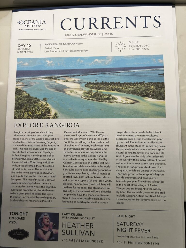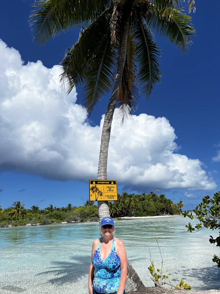 Day 15 Saturday March 21st (105 days to go) – We booked an excursion to Reef Island which is a private island with pink sand and natural swimming pools. The young man that was our guide leader and boat captain inherited this small atoll from his father. I am unsure if this is considered paradise, but it was close to it. We snorkeled and did some drift snorkeling with an unbelievable number of fish and SHARKS. We also hiked about a mile to see the Pacific Ocean. It is amazing around these islands that there are water or wave breaks surrounding the islands which are all natural made by coral. I took a picture next to some coral and the edges are razor sharp. Unfortunately, the next night after we swam with even more fish in Moorea I discovered water had gotten into my GoPro. I was able to get some rice from the ship kitchen, and I placed the GoPro into a bowl of rice and closed the lid tightly. I am hoping when we get to Sydney, I can locate a camera shop for repair work, or I will have to wait until we get home in July to ship it back and get a replacement.