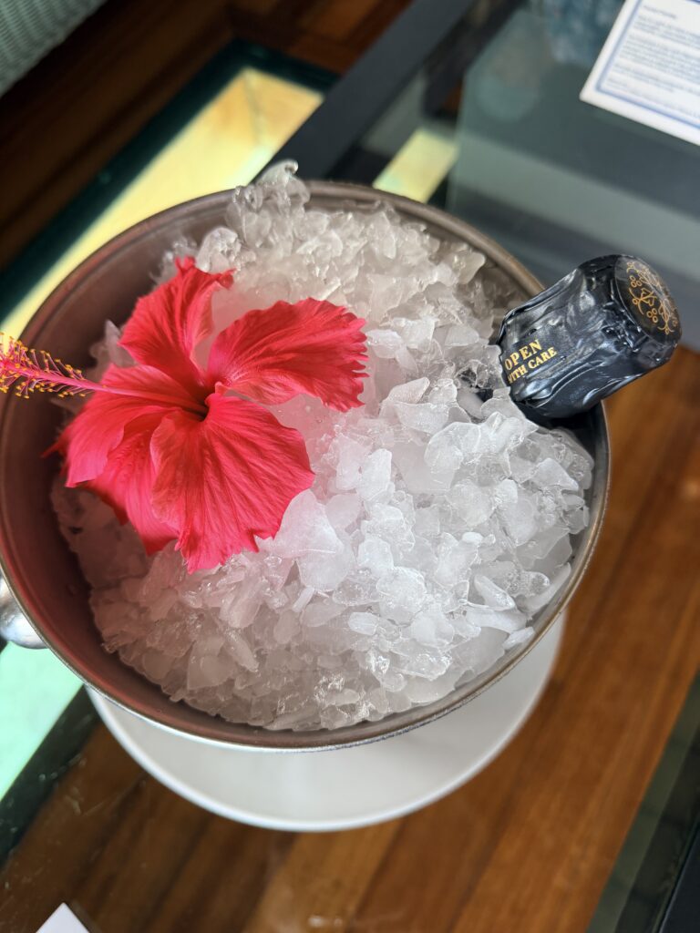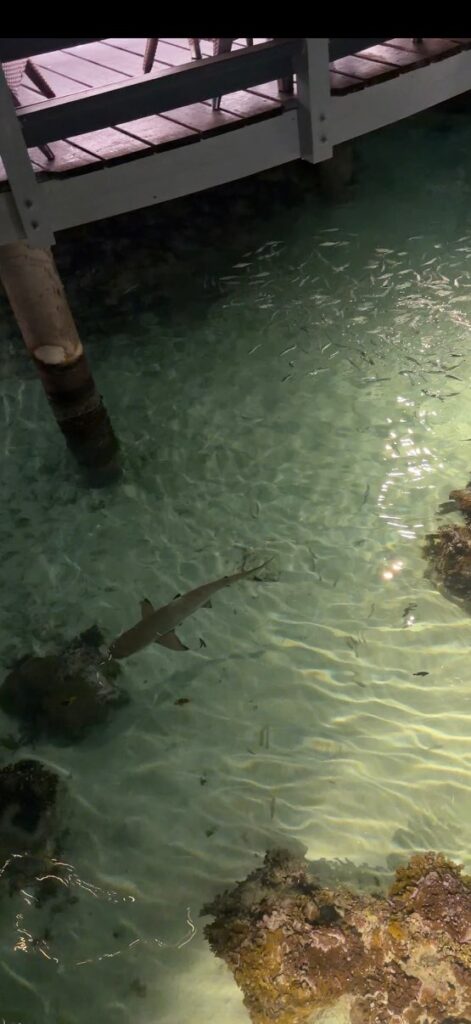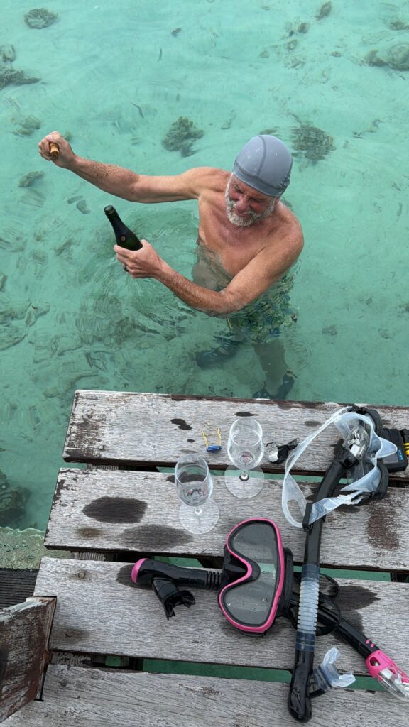 And we brought one from the ship. By the end of the night after drinking both bottles I was brave and announced I am going in ‘TOUT NU” UNTIL I saw the sharks swimming around. Even though there were black tips and harmless to humans, I didn’t want to chance losing my little buddy 🙂