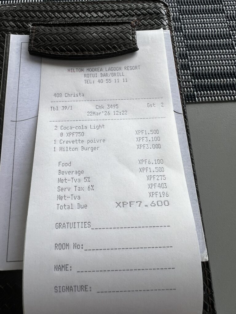 I had to laugh because the last time I was in Hawaii was in 1998 with Marie and I told her I am NEVER returning to Hawaii because a hamburger was $27.00 Fast forward to Moorea and the hamburger is $30.00 so I will say I am NEVER returning to French Polynesia 🙂 Not true of course. $7.50 for a Diet Coke