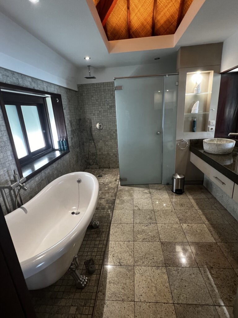 When you entered the room, the bathroom was to the immediate left, Jackie dove into that big tub as we only have a shower in the ship’s cabin