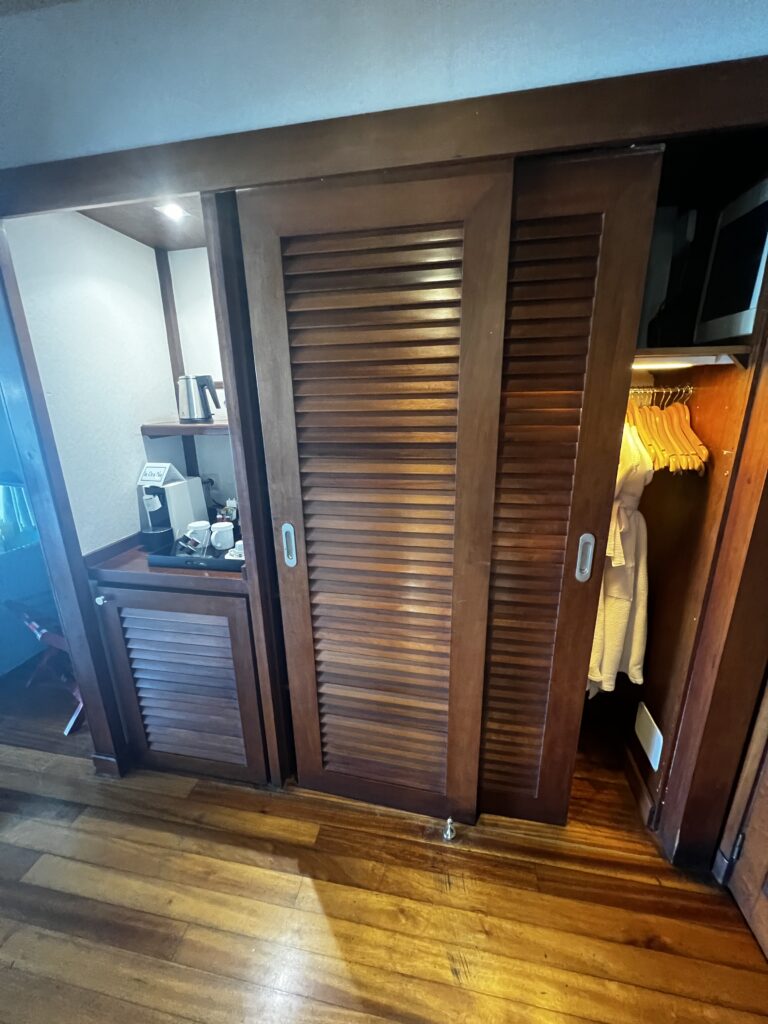 To the immediate right in the entrance was this closet area which included a refrigerator (no charge for the items inside), a safe and some cabinet drawers, hanging closet with two robes