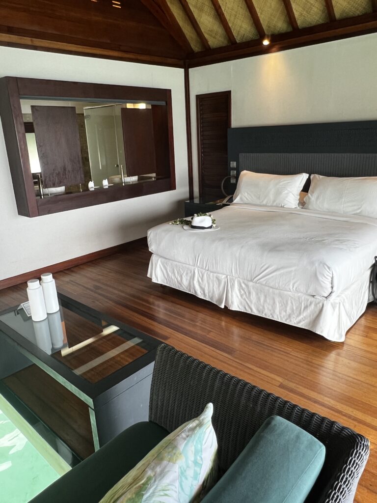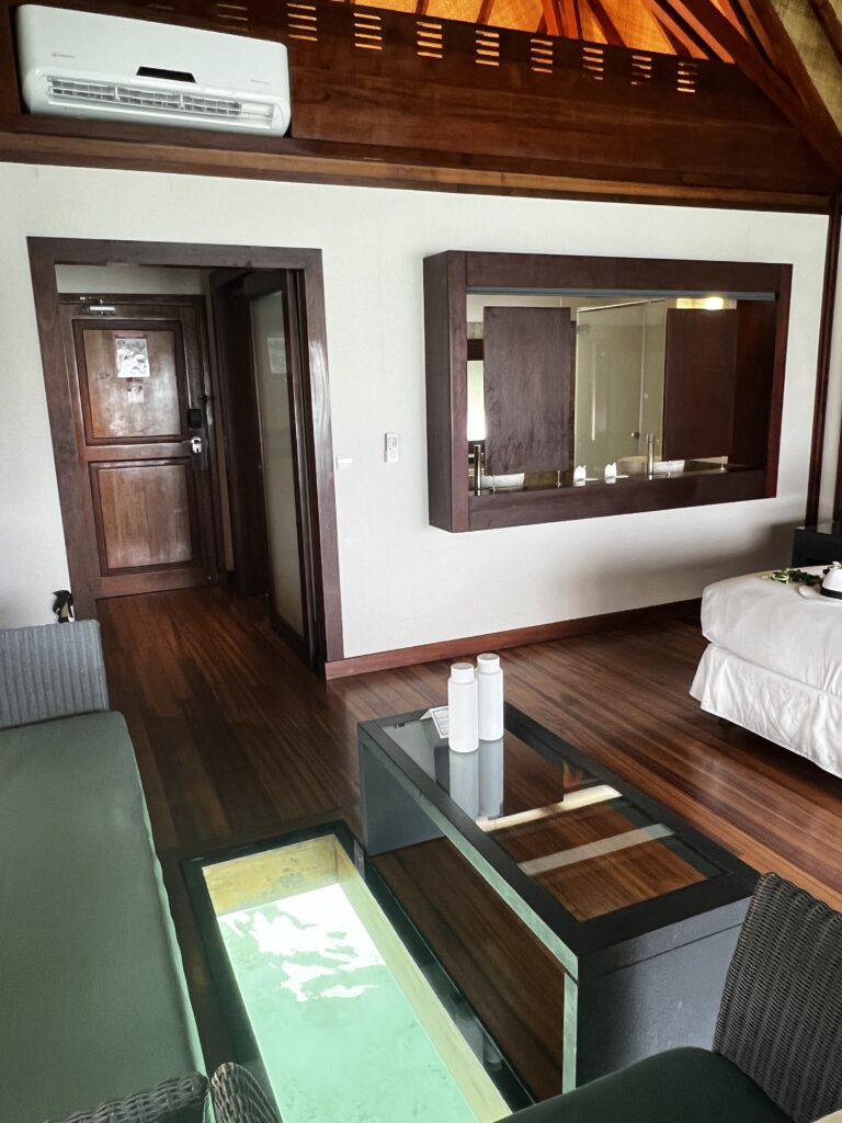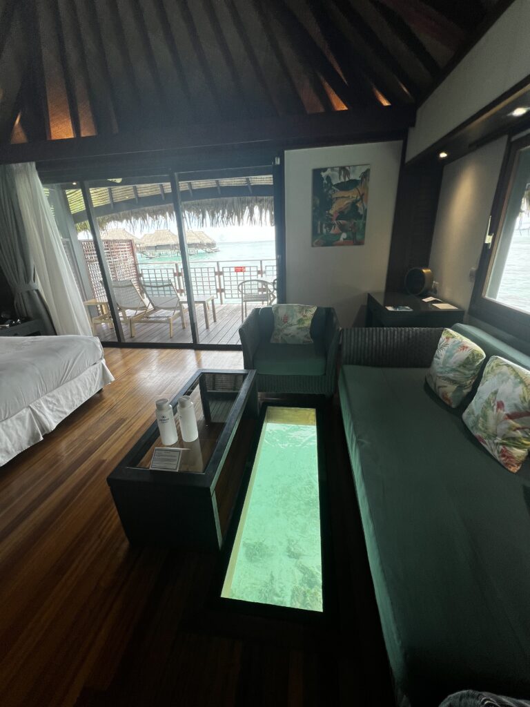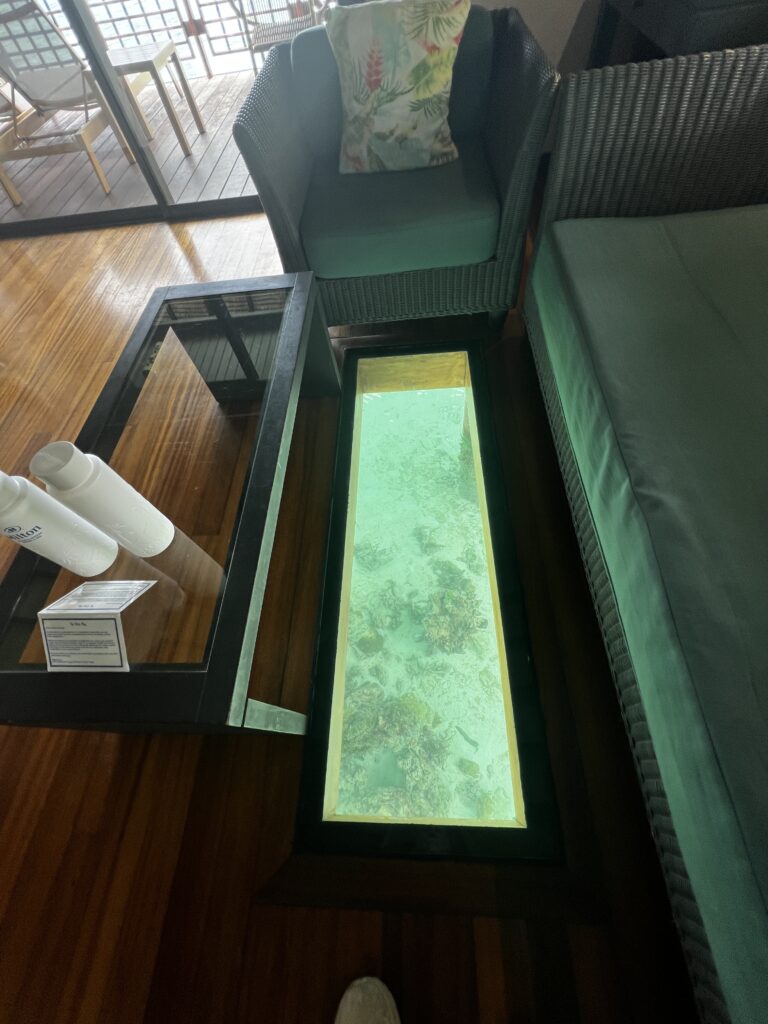 Living room area with a glass floor to view fish under the bungalow. At night you can turn on a light and watch the fish swimming around. It was really cool to see. The only complain in this room was the AC which no matter what was done, the room was ALWAYS very cold.