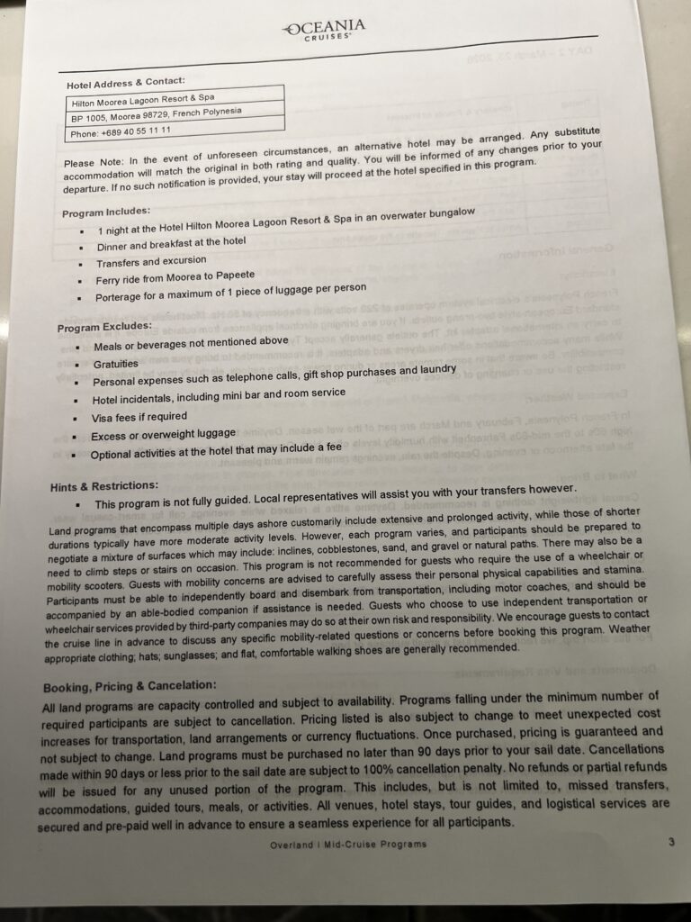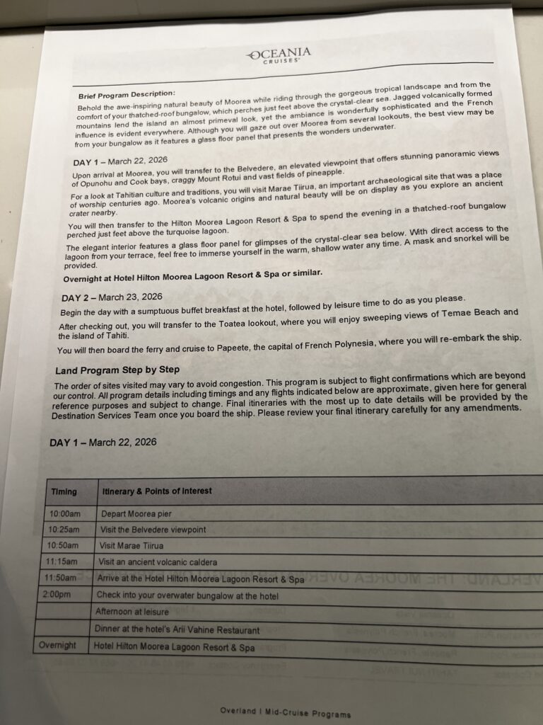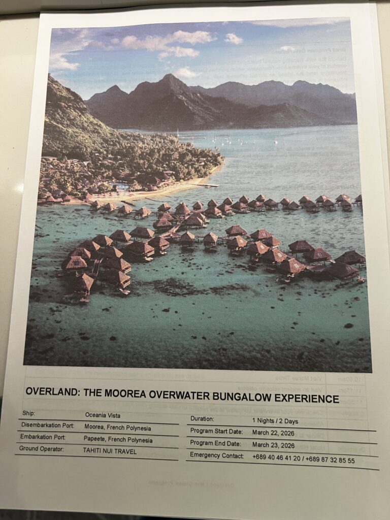 Day 16 Saturday March 22 (104 days left) — Bucket item day!!! We wanted to spend a day and night in an overwater bungalow and we had the chance to do this by booking an Oceania overland excursion. We stayed at the Hilton Moorea Lagoon Resort & Spa. It was an incredible and fun experience.