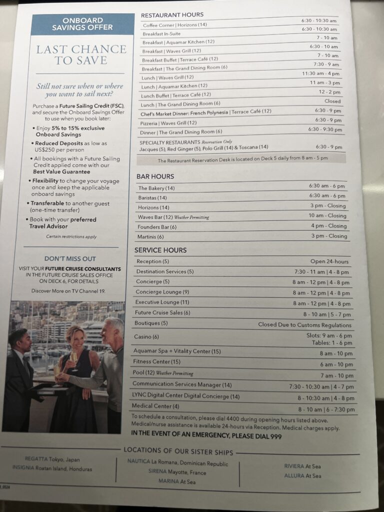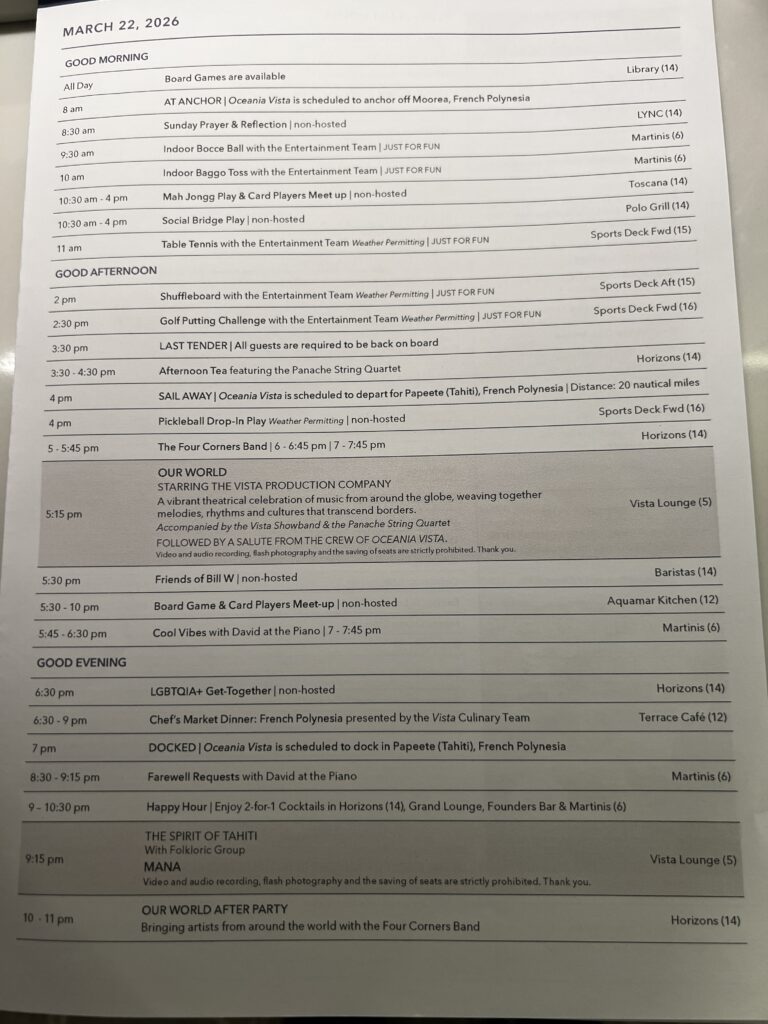 laughing…..finding it would have been easier to do ATW when we were younger. By the end of each port day we are dragging. Get back to the ship, eat dinner and in the cabin sleeping. Maybe one day we will start attending the evening functions.