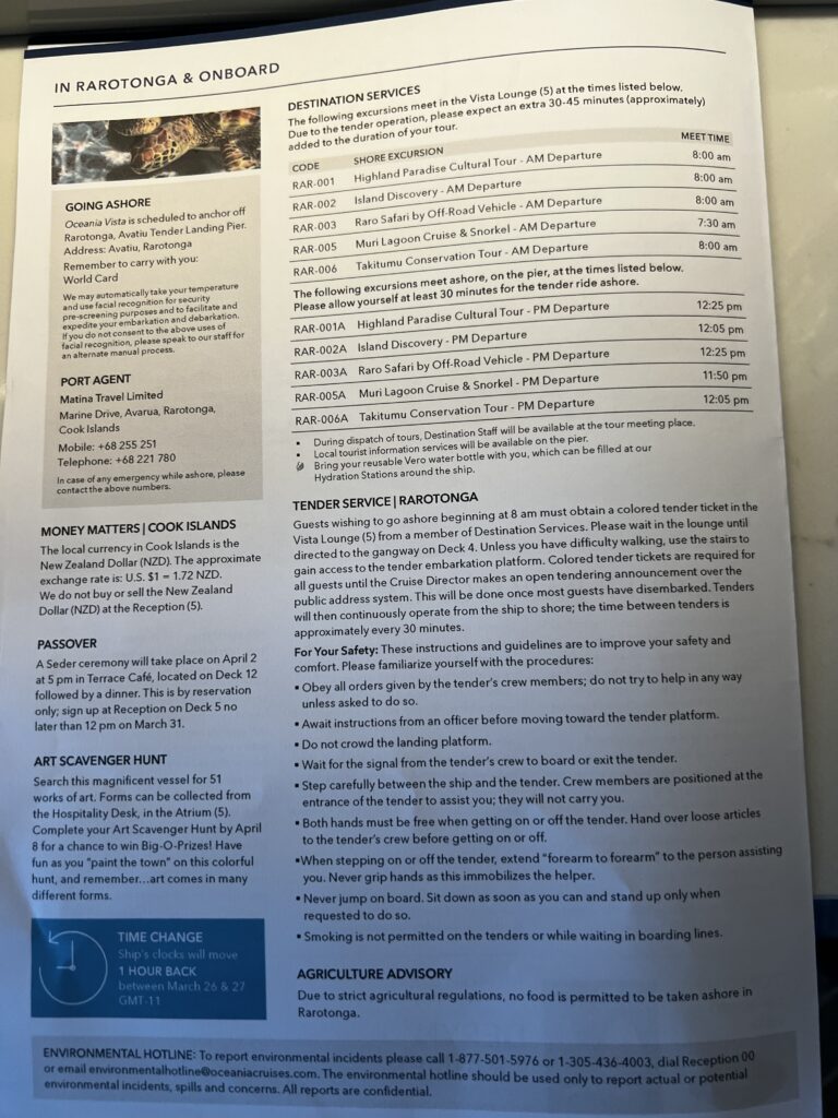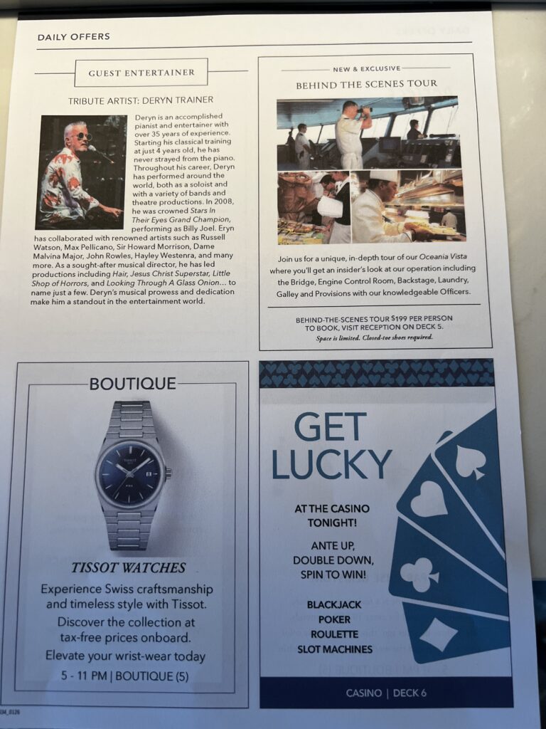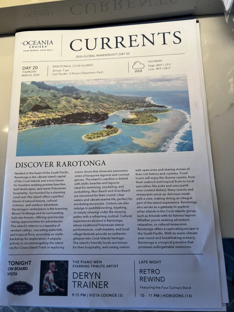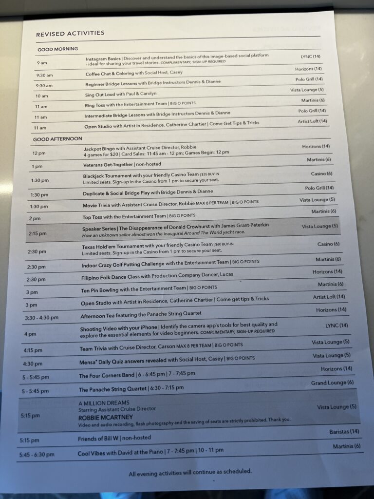 Copy of the original Currents for the port stop and the additional pages that we received with the new ship’s activities for the day.