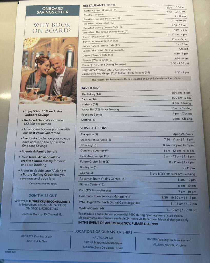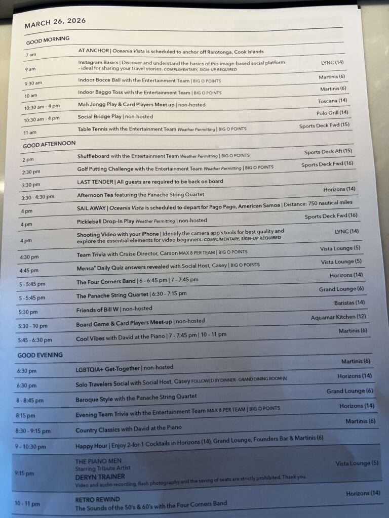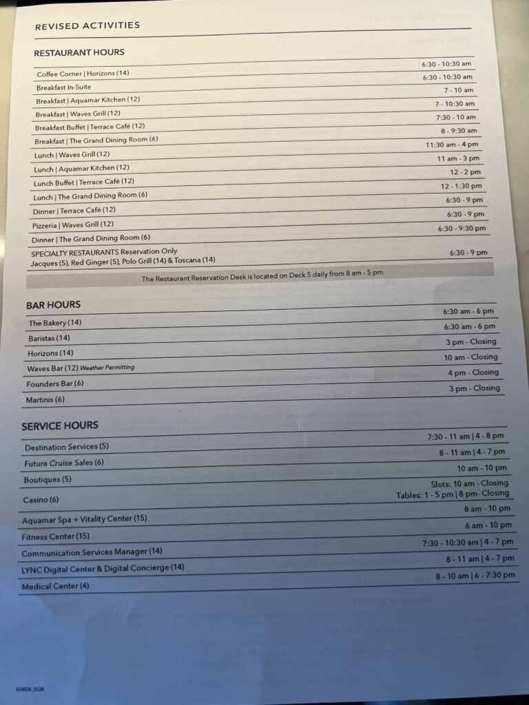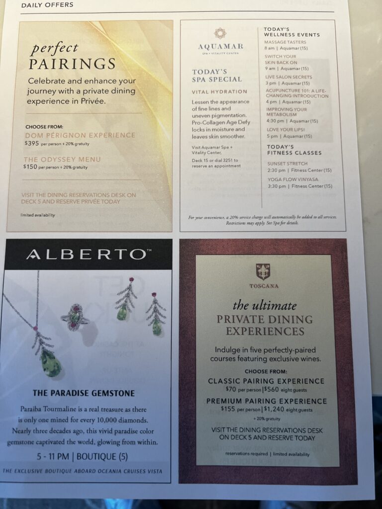 Copy of the original Currents for the port stop and the additional pages that we received with the new ship’s activities for the day.