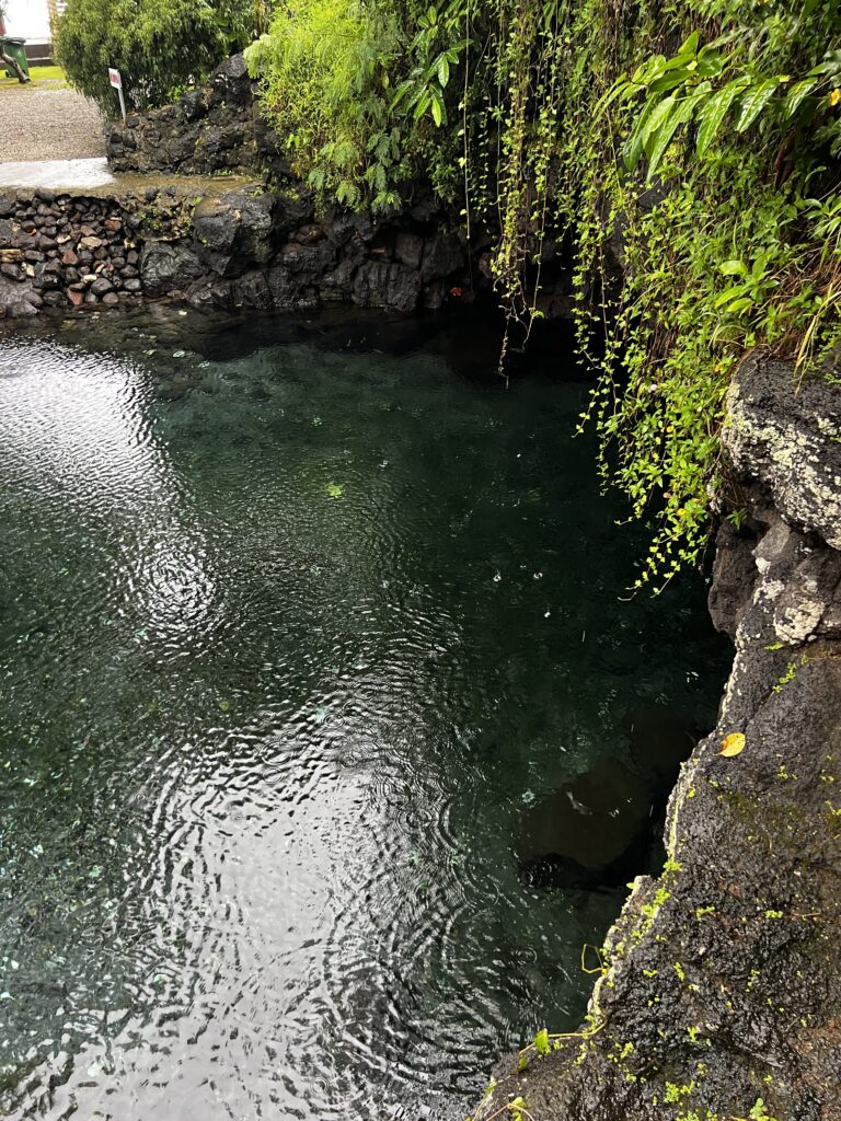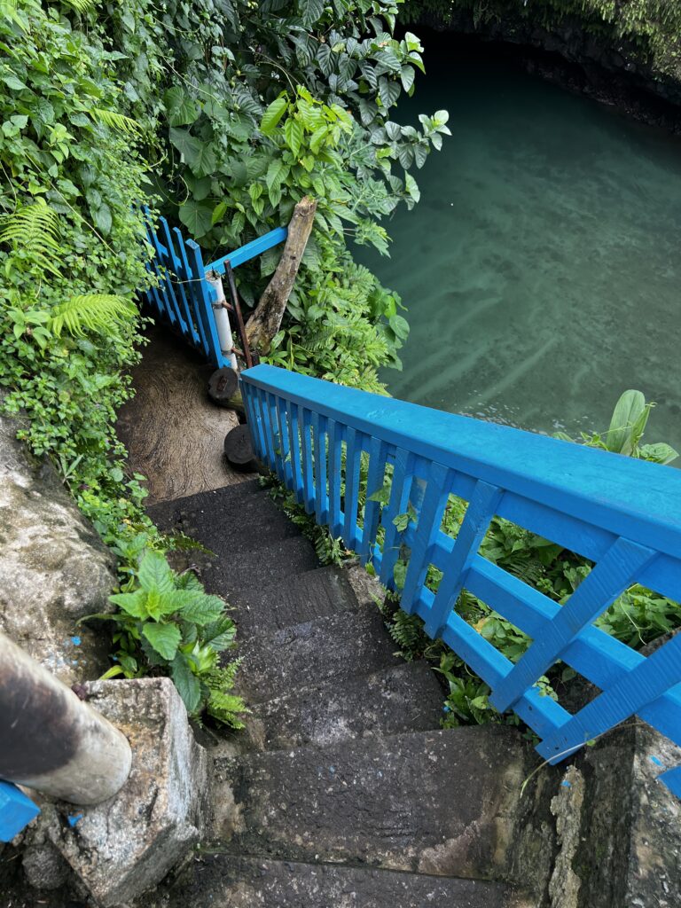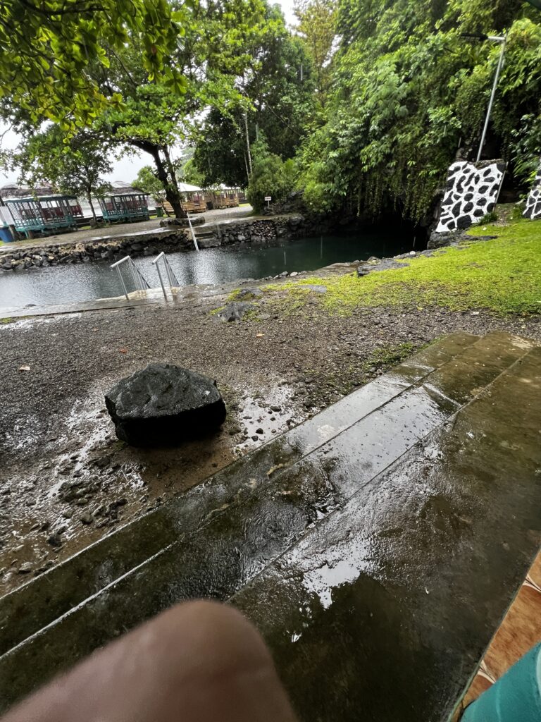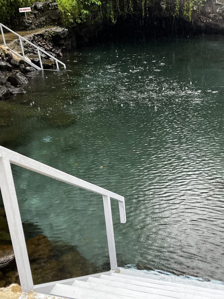 Climb down steps into the freshwater pool. The water is cold. When we were visiting the rain was beginning to fall harder.