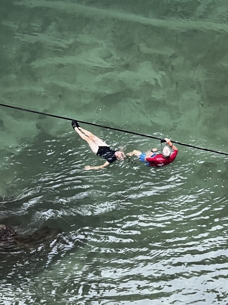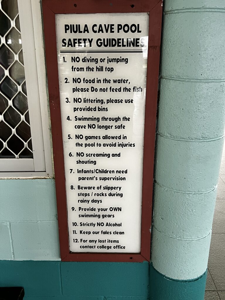 There are fish and freshwater eels in the pool. You swim into the cave and then can exit at another entrance. Sasa said you had to swim about 10 feet under water to pass through the cave.