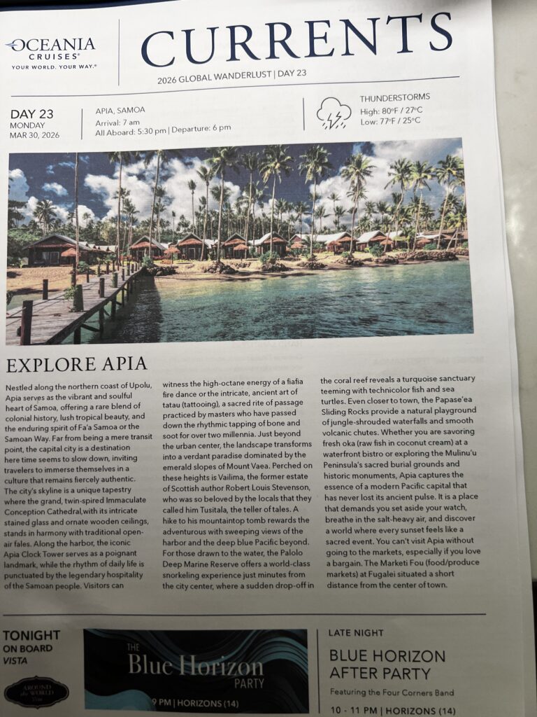 After four hours of trying to upload photos, I decided to call it quits on this day. The next morning, I was able to complete the blog for Samoa which was important for me as it included some poignant photos of a Tsunami that hit Samoa in 2009. I also was able to add a couple of small videos of a waterfall we visited. Be sure to check out the section on Faces Around the World for the residents that we captured today on our photos.