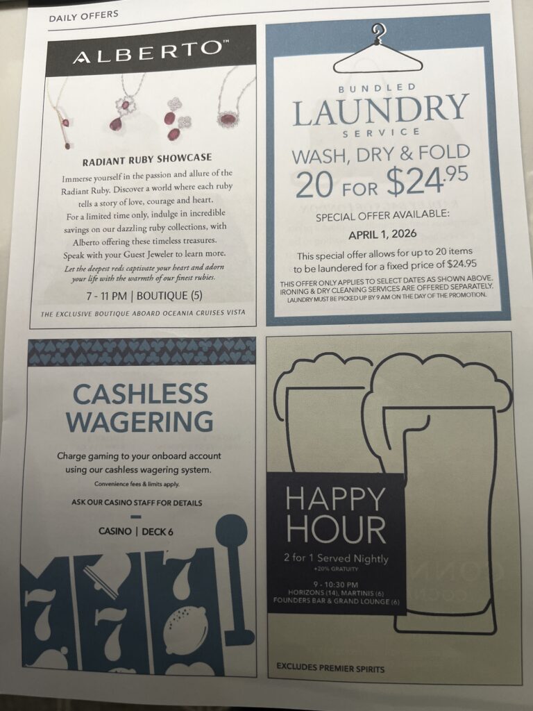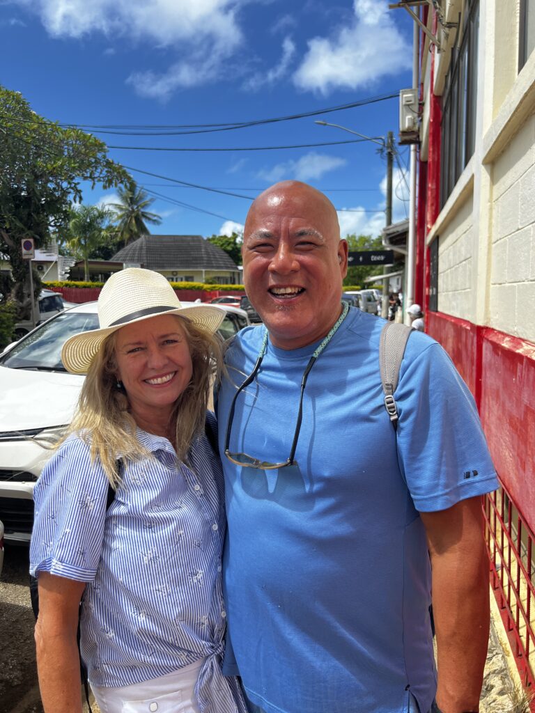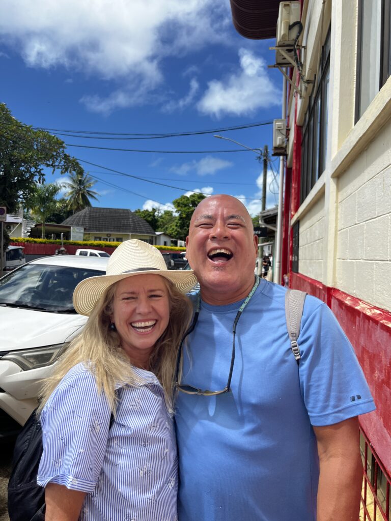 David and Marta from the ship. The big laugh is because earlier today David placed a post on his private Facebook page telling his family and friends back in the states that Oceania had cancelled the rest of the world cruise and everyone was flying home. Obviously, he underestimated the amount of Vista passengers that viewed his Facebook posts as some passengers failed to realize today is April 1st. Anyway, the big laugh is because I had just told him that about 50 people were waiting for him back on the ship. Also, in honor of Holy Week, I did like Peter and denied three times that I knew him. I asked him didn’t you hear the rooster crow three times in the town. I have not seen David on the ship so they might have thrown him overboard 🙂