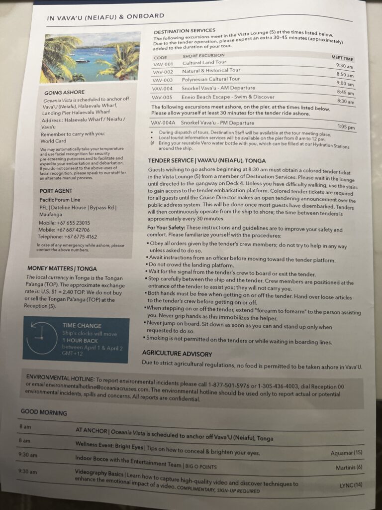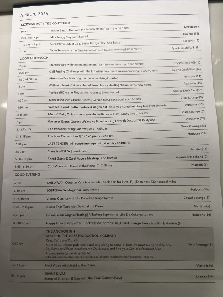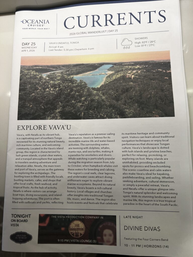 Day 26 Wednesday April 1st (94 days to go) — The original itinerary had us sailing to Nuku’Alofa but Oceania changed the destination to Vava’U (Neiafu), Tongo indicating it was a better cultural experience.