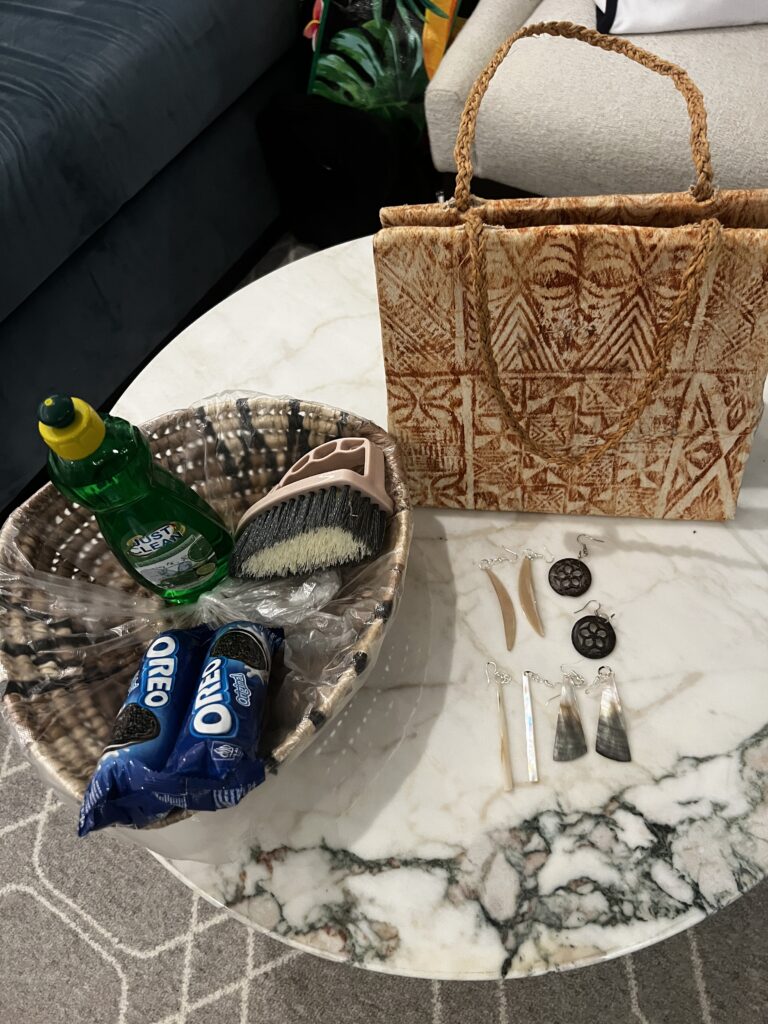 Our haul from our day in Vava’u. Can you determine what was the “NEED” in this haul? 🙂 After tropical storm in Hawaii, torrential rains in French Polynesia, steady rain in the other ports, our tennis shoes are filthy, so we need to scrub them down one sea day. Someone will argue the earrings, the purse, the basket and definitely the Oreos were MUST NEED purchases for the day 🙂