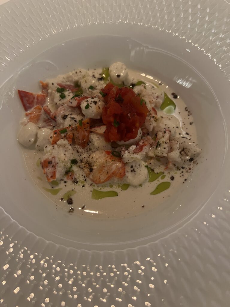 Lane had appetizer of poached scallop & lobster bouchon. Jackie just went main course tonight