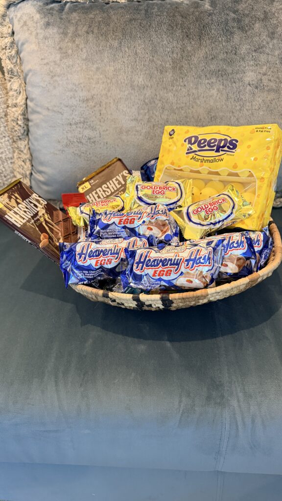 Easter morning basket. The basket went along with the Mystery Island theme. How many Gold Brick Eggs do you see? I see three and saw three when taking this photo. There were four in the box. We looked all over the cabin and could not find the fourth Gold Brick Egg. I told Jackie this egg was the important one as it held the cure for Type II Diabetes, Hypertension and these damn bug bites that have returned to my legs and arms.