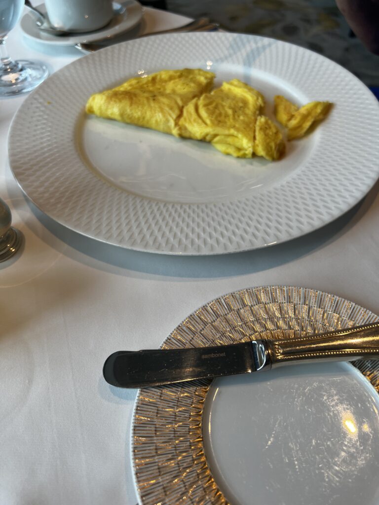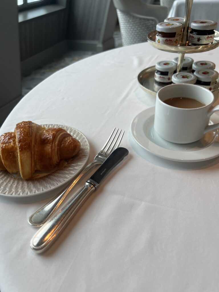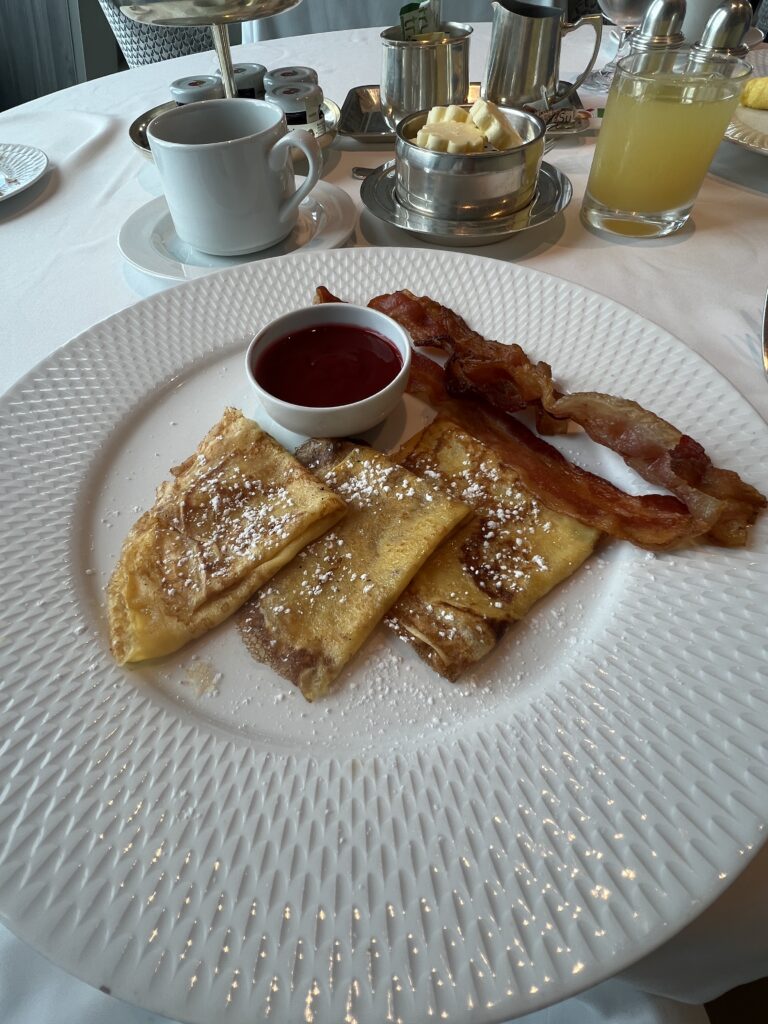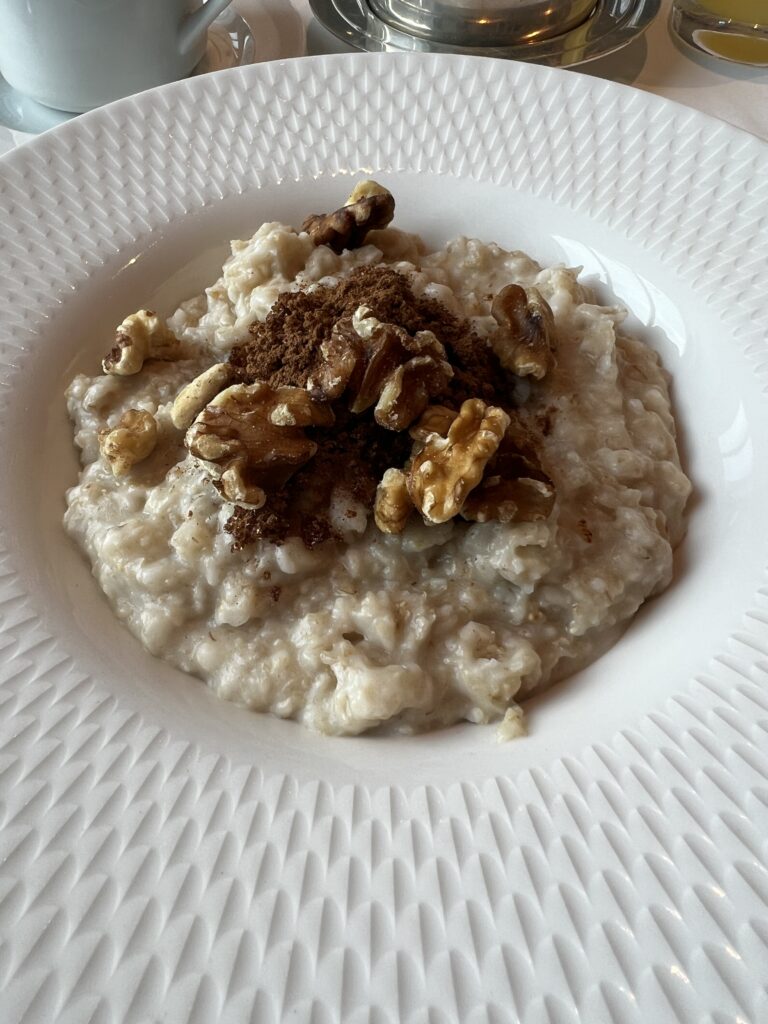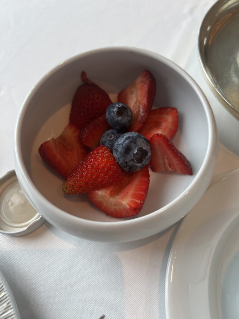 Lane had the same as yesterday — mixed berries, oatmeal and Swiss Pancakes. Oh. almost forgot added a croissant this morning