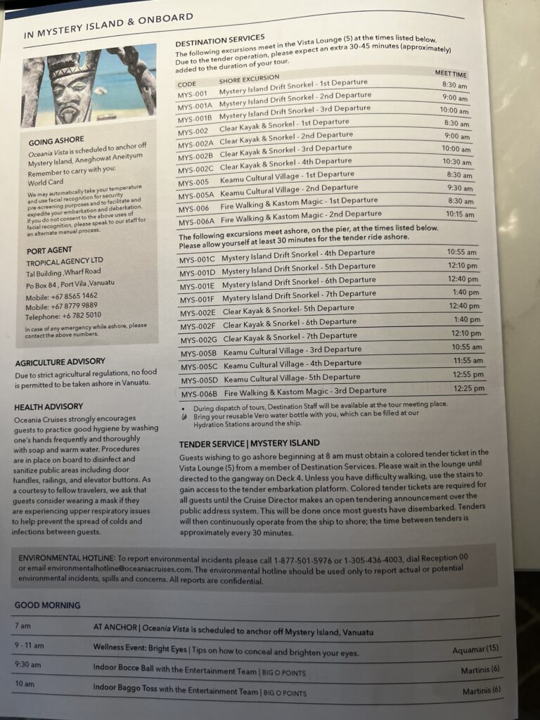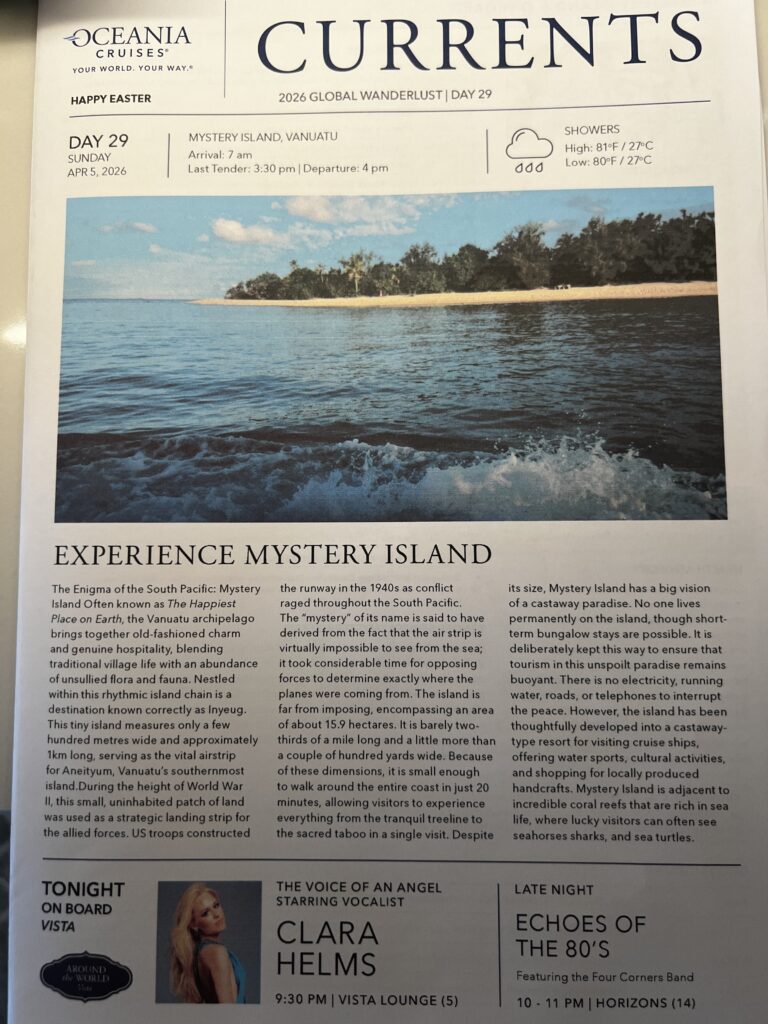 Day 30 Sunday April 5th (90 days to go) — When looking at the itinerary for this World Cruise, Mystery Island was the stop that intrigued me the most. After reading much about it and viewing photos and videos, I knew there was not much to the island. Also, I knew we were stopping here on a Sunday which meant not many if any stalls would be open. Add in Easter Day and we pretty much knew the island would be deserted, which it was and honestly we were happy about not having to deal with vendors.