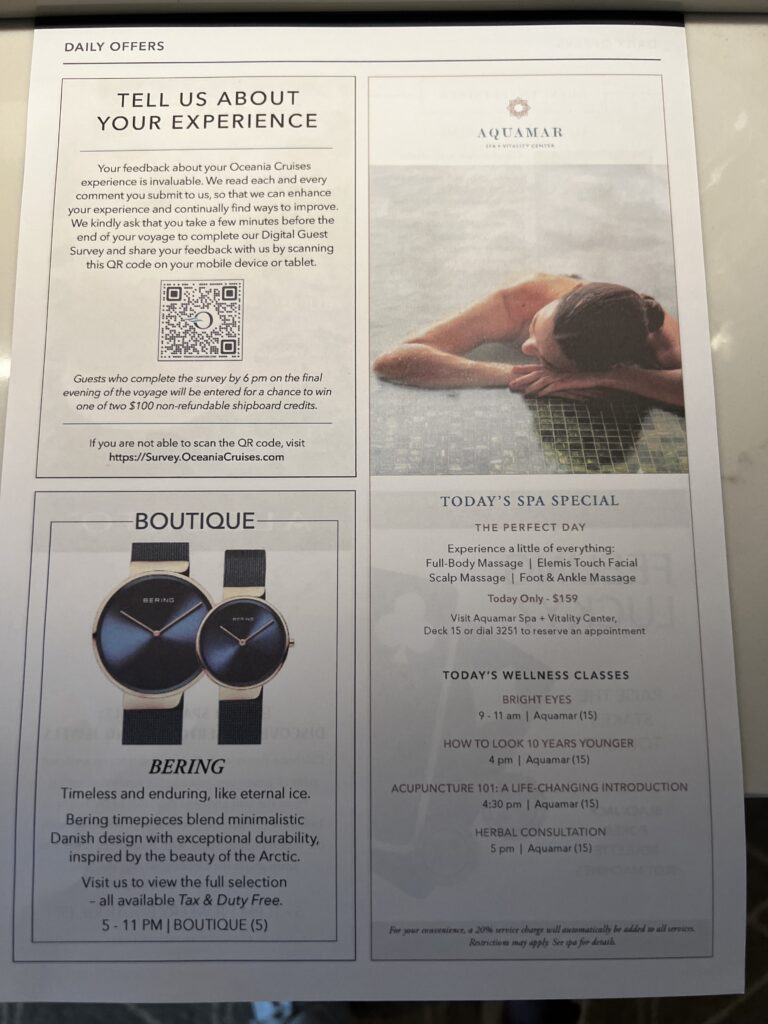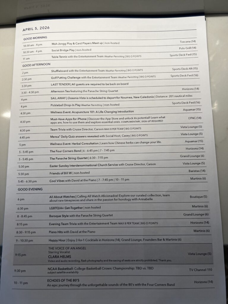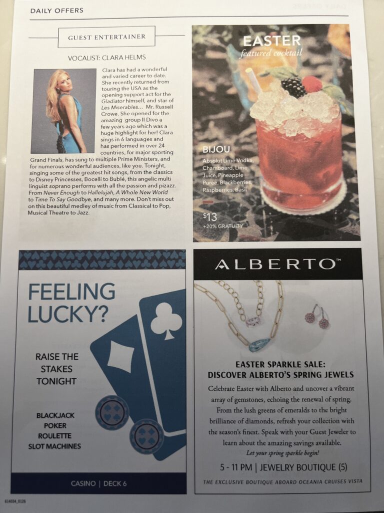 This evening we attended Easter service which was lead by the ship’s cruise director. He was quite impressive and we enjoyed it.