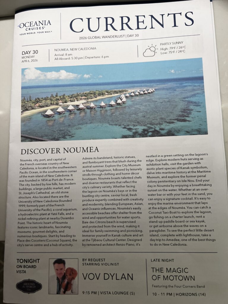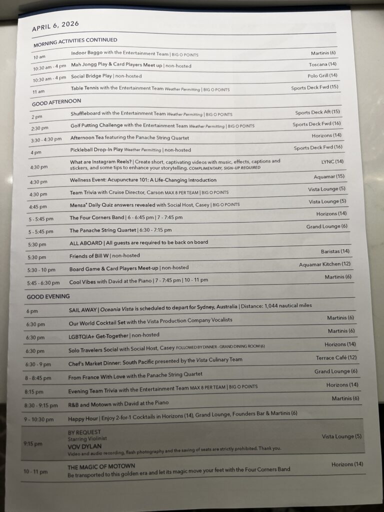 2026 World Cruise Day 29 April 4 – At Sea Day 29 Saturday April 4th (91 days to go) — So, last night we skipped Read More