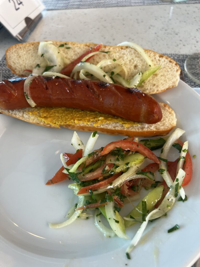 Lane’s lunch today was a sausage (hotdog) on a bun.