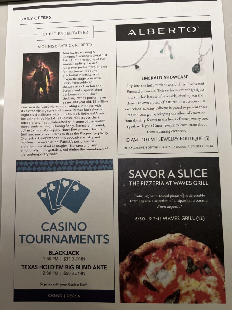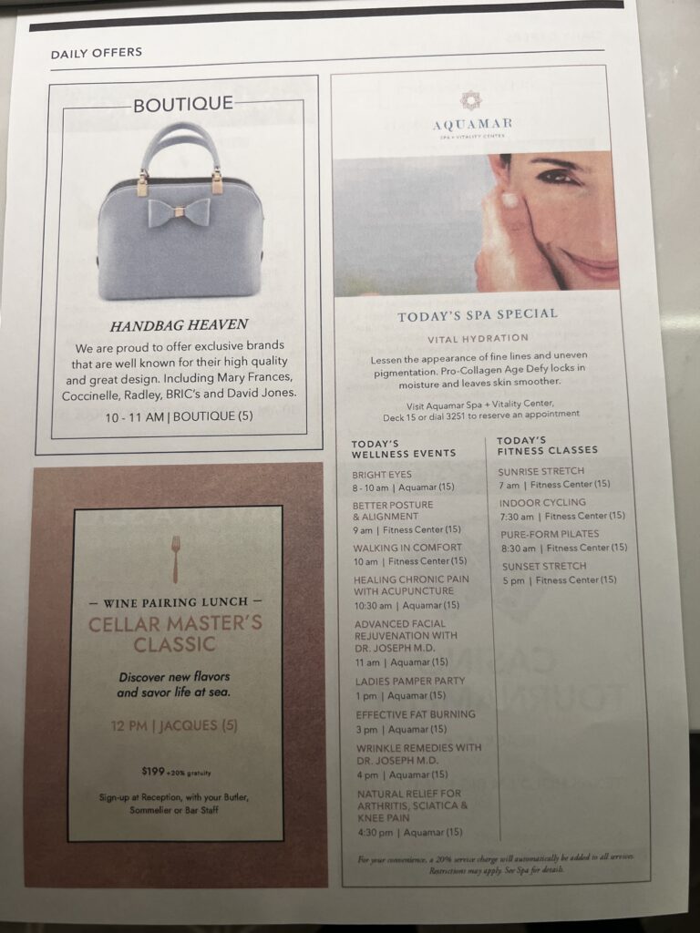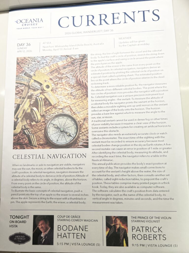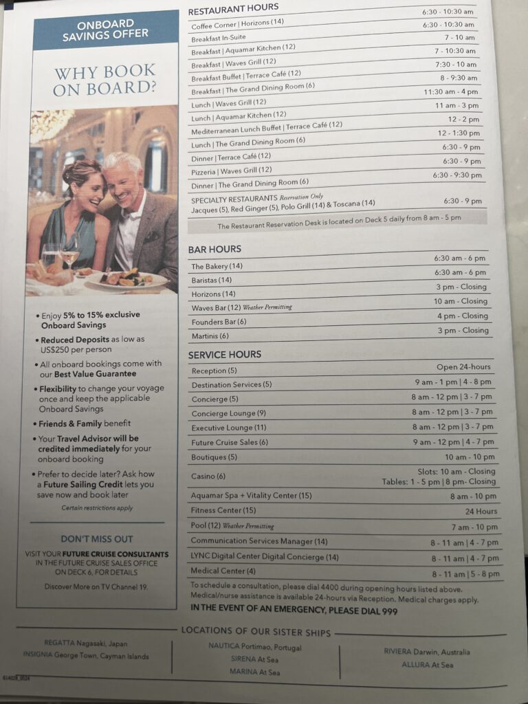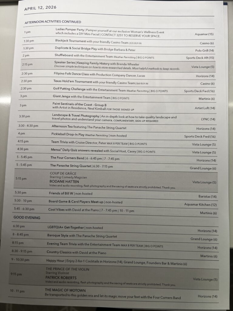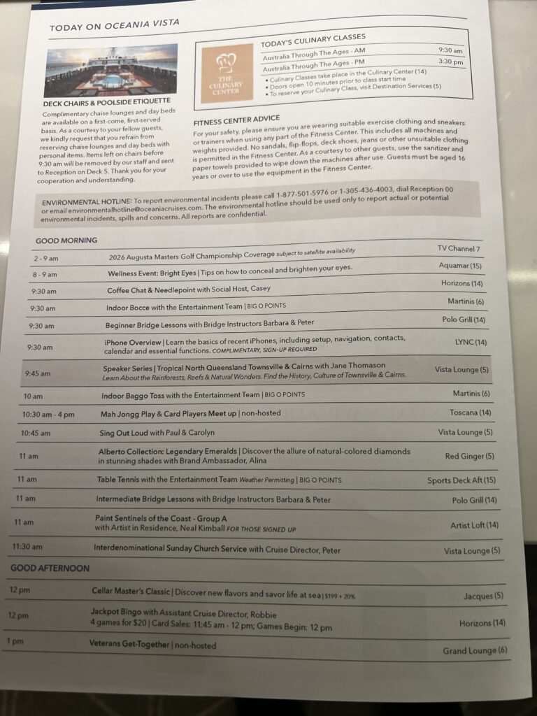 Day 37 Sunday April 12th (83 days left) — After our night out the evening before celebrating Stephen Deboo’s birthday we slept in this morning. We grabbed a quick meal for lunch at Waves Grill and The Terrace Buffet. This afternoon we tried to book a plane or helicopter flight to The Great Barrier Reef but everything was booked so we will spend the day on an Oceania excursion to Airlie Beach. In the afternoon we went back to The Spa Deck for a jacuzzi soak and we both fell asleep on the deck. We returned to the cabin and I slept more while Jackie watched the baby eagles on TikTok. 🙂 This evening we had dinner at Toscano (the Italian restaurant on The Vista) before returning to the cabin to get some more sleep.