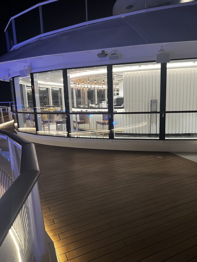 This evening we ate at Toscano and her are a few photos as we walked on deck 14 to the restaurant. This is the view facing the back (aft) of the ship. The windowed area is Baristas with the library to the right. On deck 12 (below Baristas) is a large illuminated map showing the ship’s location.