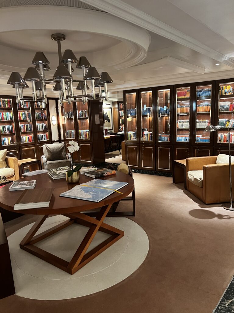 The library on the Oceania Vista is a tranquil, Ralph Lauren-styled, top-ship sanctuary located on Deck 15, adjacent to Baristas coffee bar. Featuring floor-to-ceiling windows with panoramic sea views, it offers over 1,000 books, periodicals, and board games in a luxurious, quiet setting.