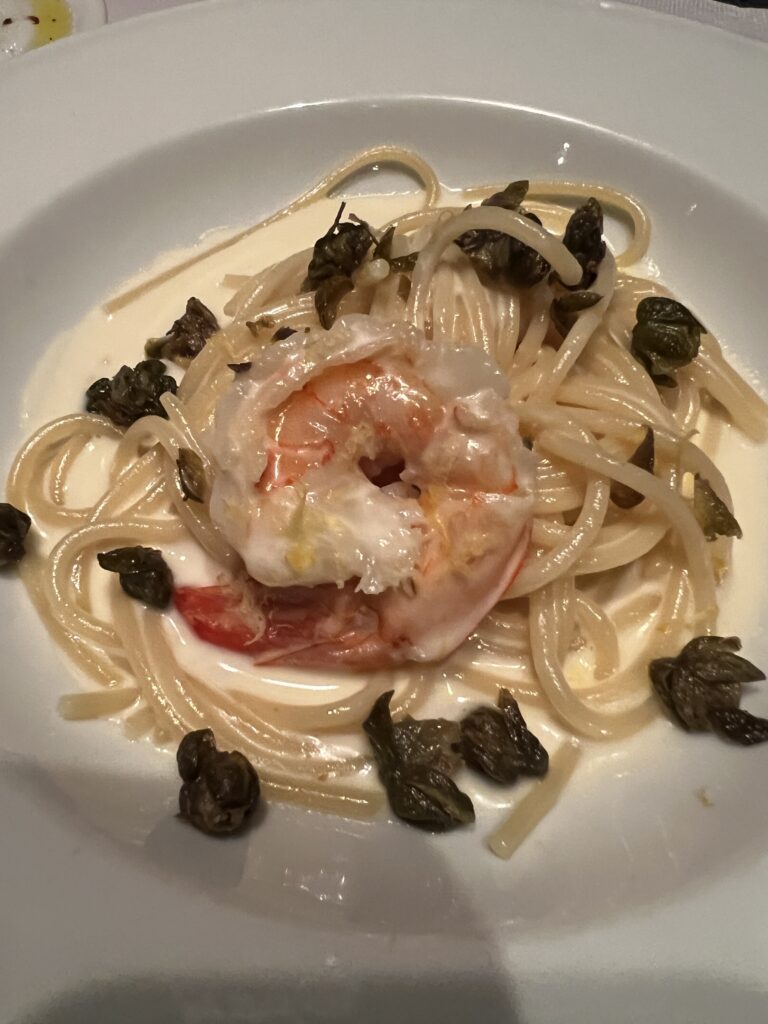 Both of us had appetizer sizes for our entree. Jackie had the ship’s Godmother Giada de Laurentiis Signature Capri-Inspired Lemon Spaghetti which is made with lemon cream, shrimp, mascarpone, Parmesan and fried capers