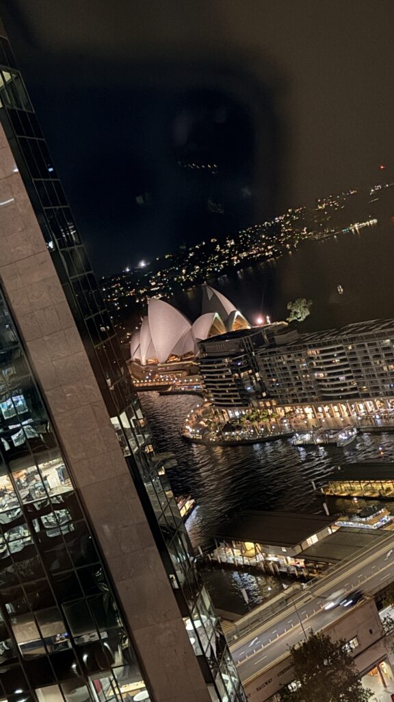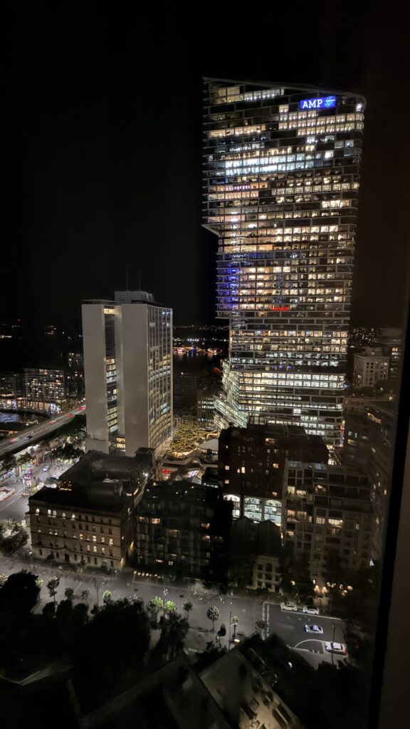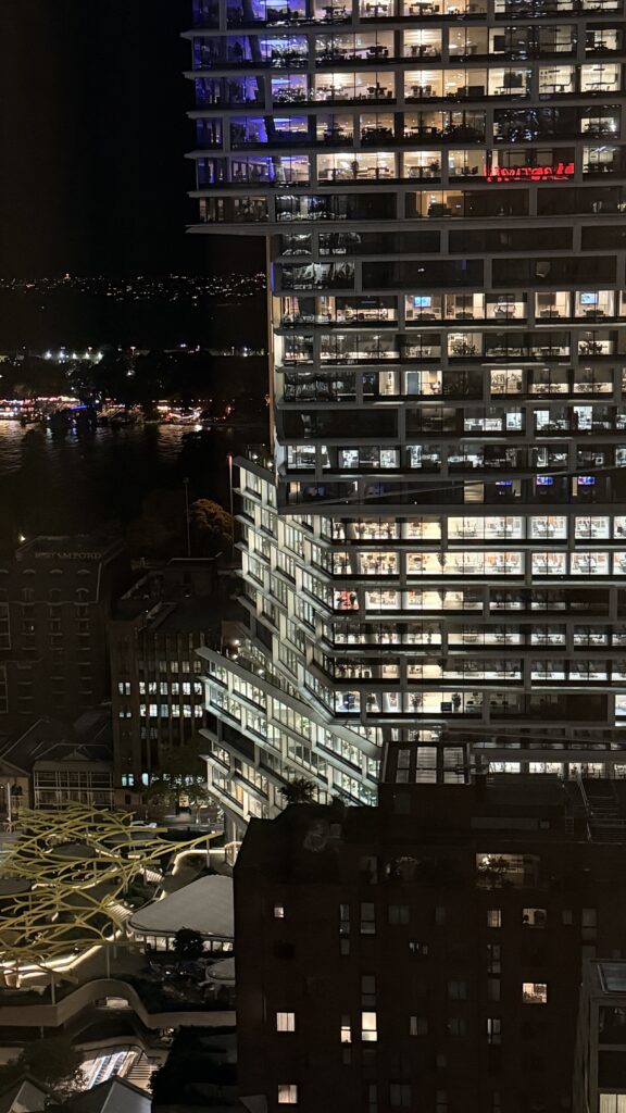 So, we left the ship around noon after having been stopped in the terminal by security and filling out paperwork that the ship should have given to us when we walked off the ship, we called a Uber and were on our way to the Townsville Airport. Although end of that story a new one started when our flight was delayed by an hour due to mechanical issues with the plane. Finally, we arrived at the Sydney Harbour Marriott Hotel at Circular Quay. We arrived the same time a bus load of Japanese tourists arrived, and Jackie used what she learned from me when dealing with crowds of people……kill or be killed as she hurriedly got into the line to check in. 🙂