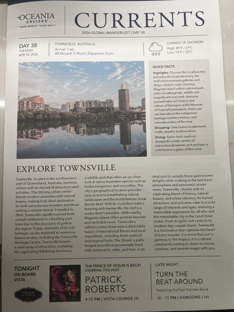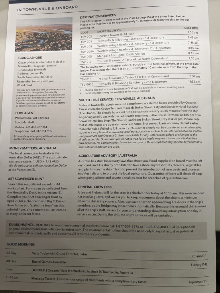 Day 39 Tuesday April 14th (81 days to go) — We had planned to fly from Townsville to Sydney so we could spend a few extra days in Sydney. This was planned and approved by Oceania Corporate Offices in Miami three months before our embarkation. On the day we boarded, the cabin’s butler and housekeeper spoke to me about us getting off in Townsville and getting back on in Darwin. This meant the ship knew of the plans. On the second day after we boarded in San Diego, I went to the reception desk to provide them the email from Oceania Corporate. Yesterday, I went to the reception desk to remind them we were getting off today and asked for our passports. I was told to return today as the passports were needed for review by the Australian authorities. When I went this morning to retrieve the passports I was told there was a problem because I had not informed the reception desk of our plans and we probably would not be able to get our passports and disembark. The person helping me asked who I had spoken to about this when I boarded and who I spoke to yesterday. Like really, I am going to remember anyone’s names. He went speak to the purser (who never came out of his office —- real chicken shit if you ask me) and I was told they would attempt to have Australian authorities come to the ship to meet with us face to face. They called us at 11:30am to let us know the authorities were onboard to meet with us and we needed to bring our luggage and prepare to disembark if we were allowed by the authorities. We went down, answered a few questions and they went through our two carry-on pieces of luggage. The gentleman and lady from Australian border patrol could not have been any nicer to us. They gave us information on where to eat in Sydney and in Darwin upon our return. Lesson learned today —- since we have had issues with reception telling us one thing and then changing, every time I go down there and have to meet with someone from now on, I am going to take a photo of their face and name tag. Possibly I will write up what we discussed and have them sign it.