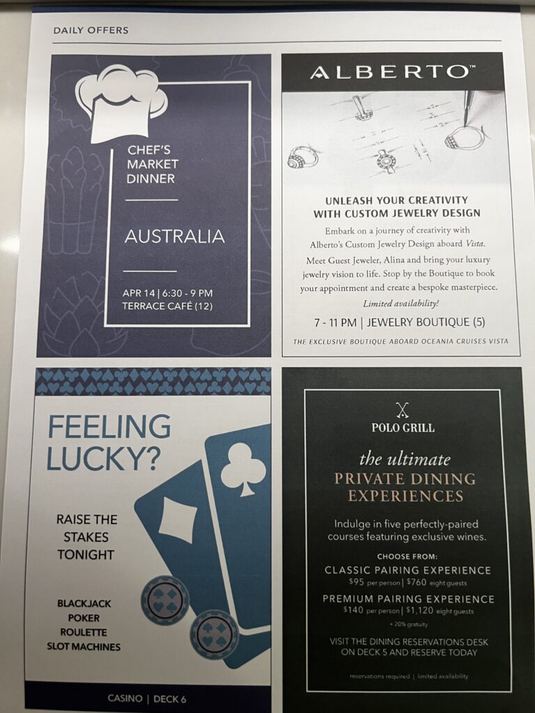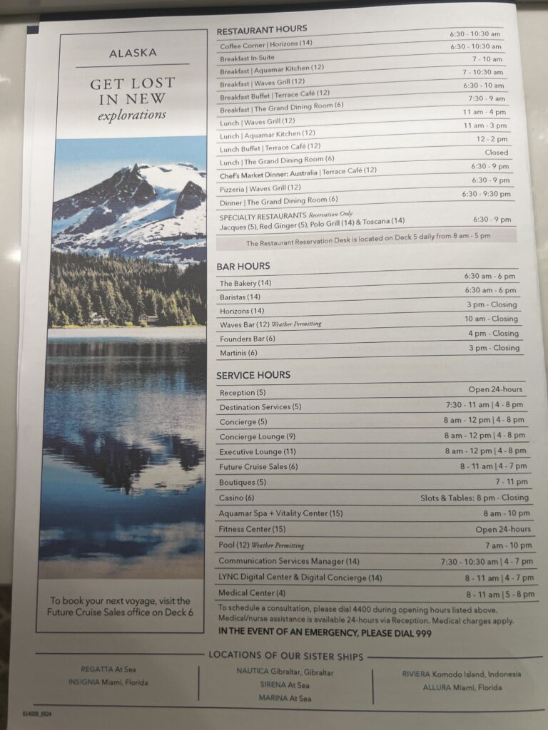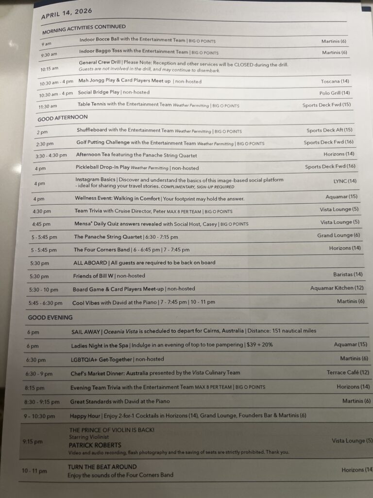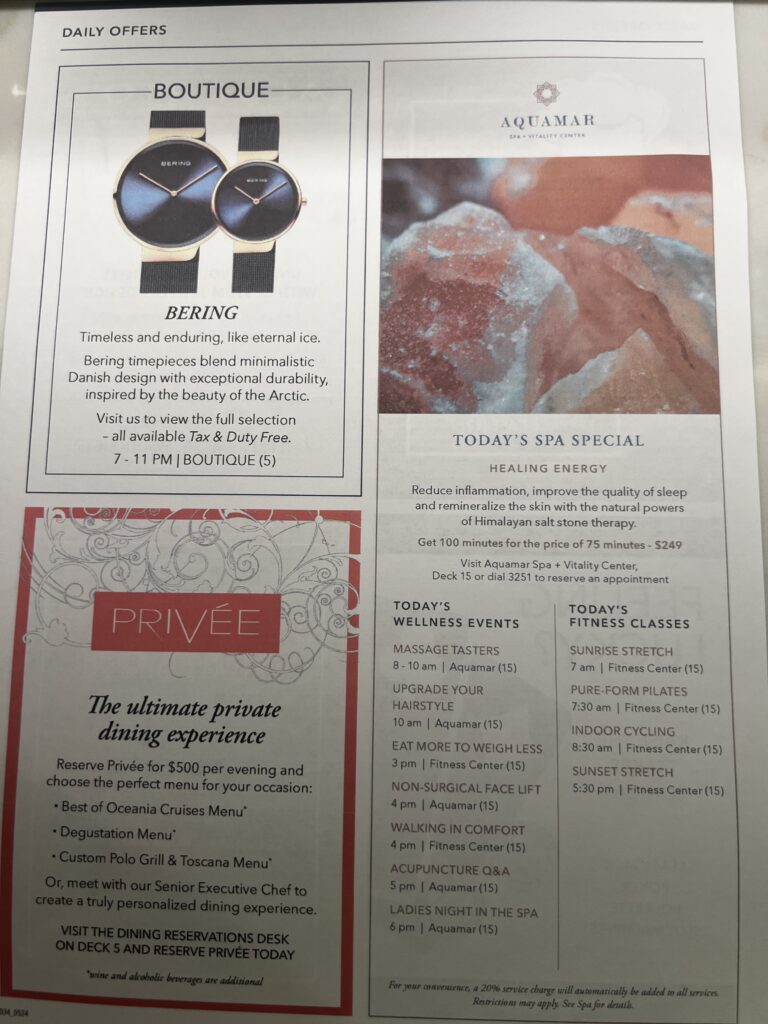 Physician’s appointment this morning and fingers crossed that will resolve this issue. Joan, the communication or follow through from the reception and destinations desk has been simply — terrible. I will post on the 2027 group, but I am hoping that people will take notice especially about the 25% discount when booking Oceania excursions. We have been told by staff there is a glitch in the system and the 25% is not applied unless you go to destinations and reception and not ask but fight for your discount. When we return to the ship we have to check if it was granted to our account because Jackie was told since we have taken some of the excursions they cannot go back and give us 25% back. Also, the charges and credits are a total fiasco. If you read David Chen’s post, you will get an idea what is going on. DO NOT EVER look at your account on the TV screen as it is NEVER correct and a hard copy is valuable but just as confusing.