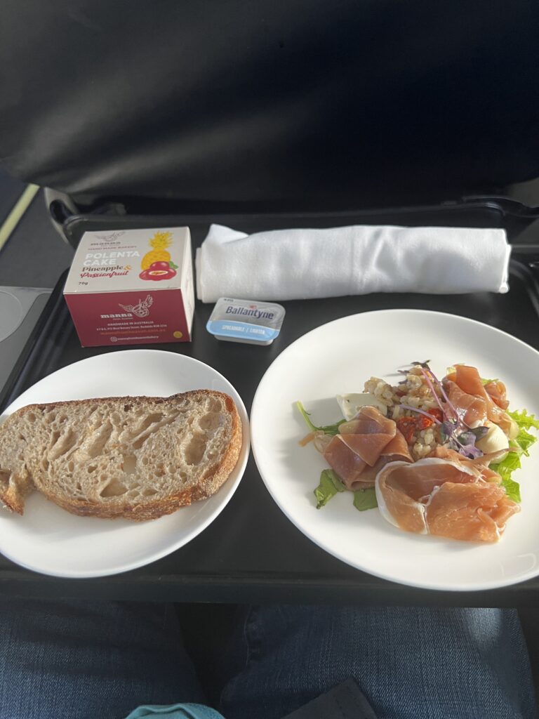 First time flying on Quantas and we were served a meal on the 2 hour 45 minute flight. This is Lane’s Prosciutto salad