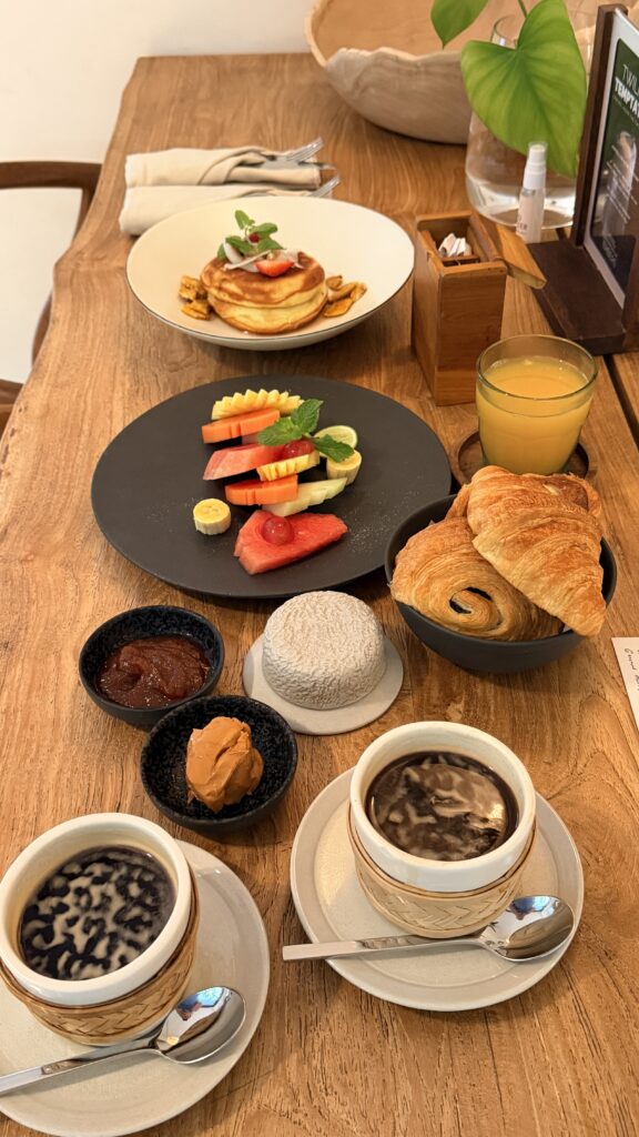 We had to order our breakfast the night before so it could be delivered to our hotel room when the restaurant opened. Jackie had banana pancakes and I had fruit and pastries. It was an excellent breakfast although the coffee was not Luwak Coffee. I bring this up because we had a good laugh about it tonight with Kevin, Holly, David and Marta over dinner. We told them Saturday at 1:30pm everyone has to drink some or they are no longer part of the cool group…laughing