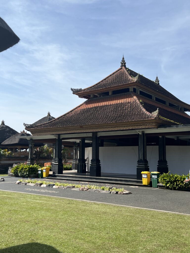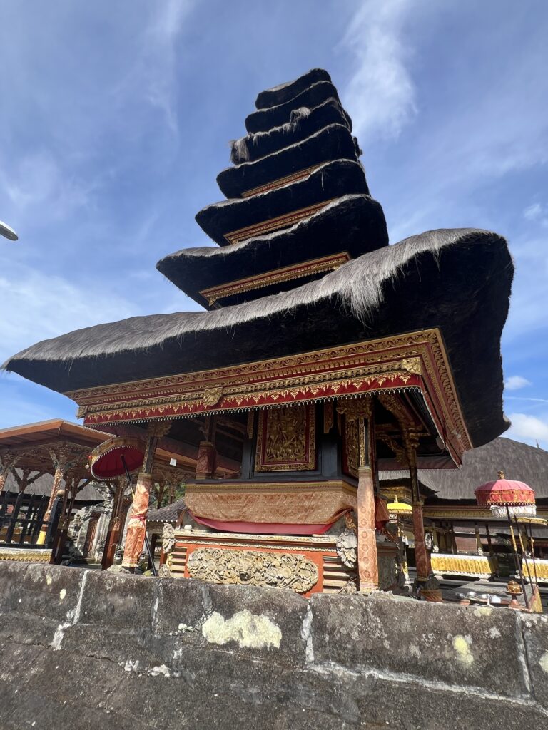 In BaliHindu temples are known as “pura“, being designed as open-air places of worship in walled compounds. The compound walls have a series of intricately decorated gates without doors for the devotee to enter. The design and plan of the holy pura follows a square layout.  A typical temple is laid out according to ancient Lontar texts with three courtyards separated by low walls pierced by ornate gateways. The outer courtyard is for secular pursuits, with pavilions used for meetings, resting performers and musicians at festivals. Food stalls are set up here during festivals. The middle courtyard is a transition zone between the human and divine sections; here offerings are prepared and temple paraphernalia are stored. The inner courtyard is the site of the shrines and religious ceremonies. The shrines are known as merus and are square structures with brick bases and multiple pagoda-style thatched roofs; the number of roofs reflects the status of the deity, and is always an odd number. The temple complex consists of five various shrines dedicated to other Hindu gods as well.
