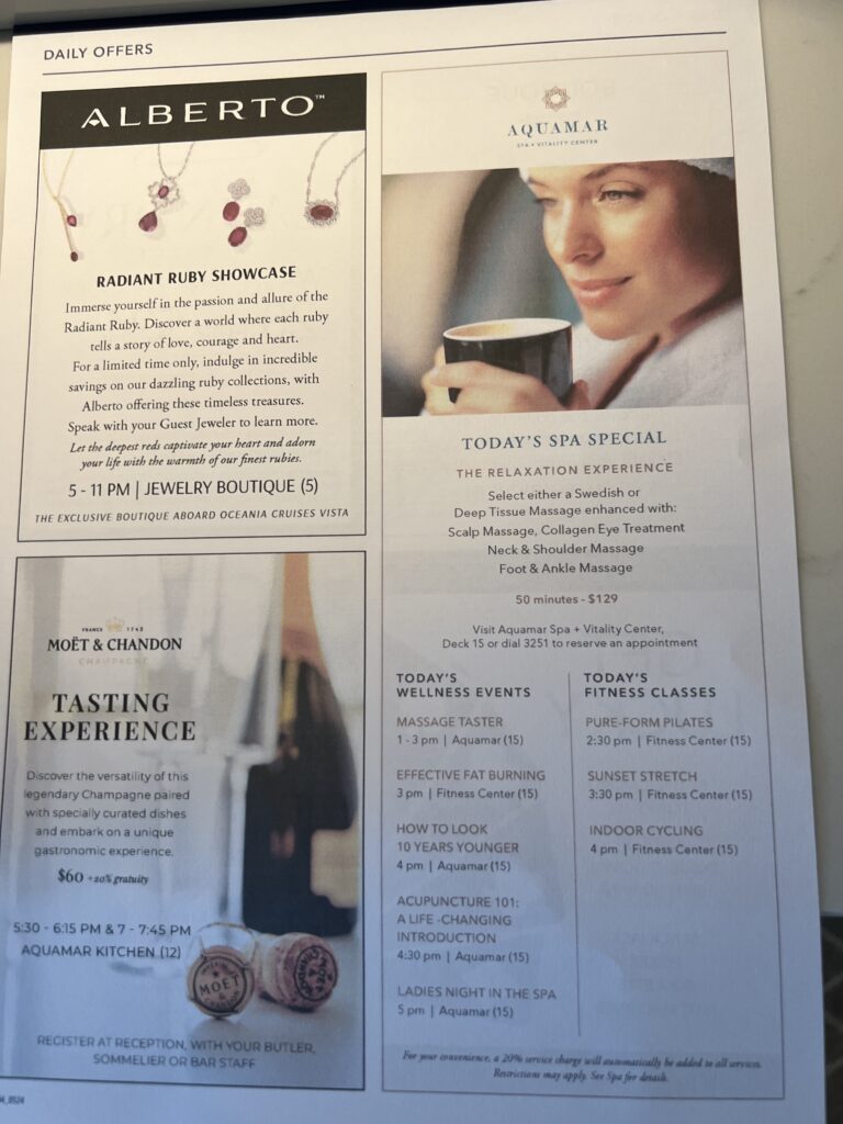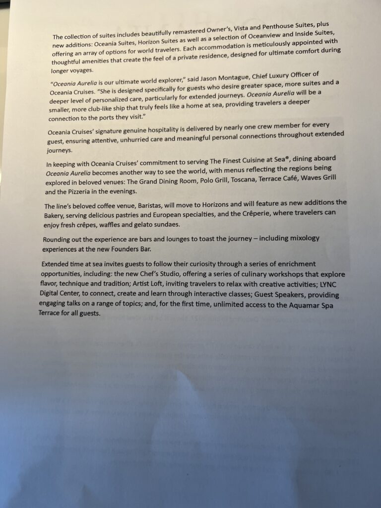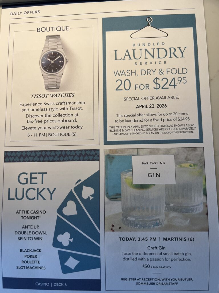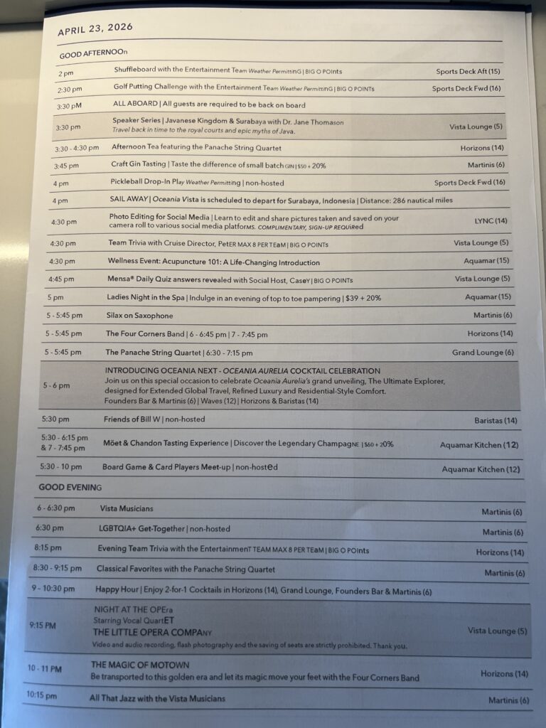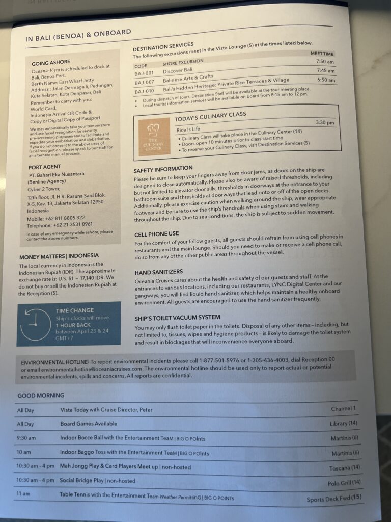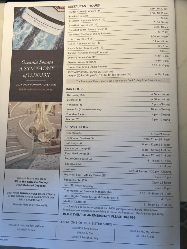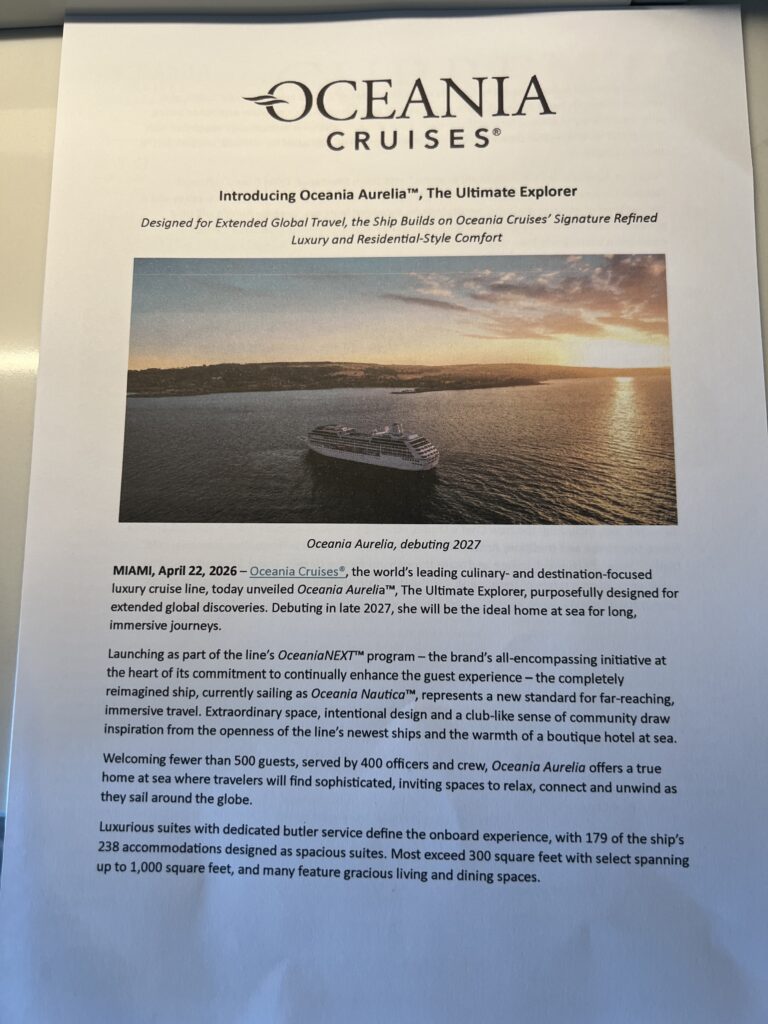 These are the sheets we found in our cabin upon our return. It looks like Oceania is renovating an existing ship (Nautica) to do exclusively World Cruise. Nautica is the first Oceania ship I ever sailed on. It will be a great ship with its small size and low passenger capacity for future World Cruises. Passengers I spoke to this evening about the new ship had the same question that I had. Is there going to be working Wi-Fi on this ship?