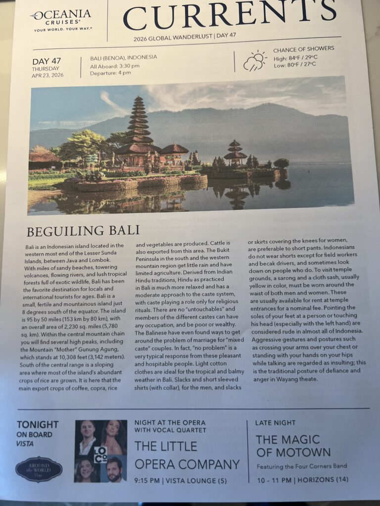 Day 48 Thursday April 23rd (72 days to go) — Our second day in Bali started early as we were driving another hour or more north away from the port. We only had one request for the day and that was to visit The Beratan Temple in Bedugul, Bali.