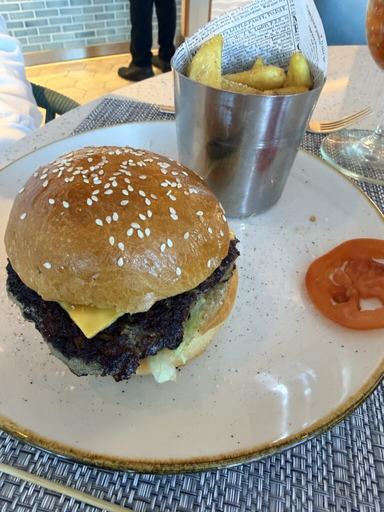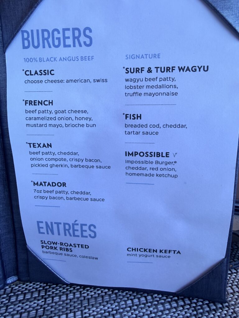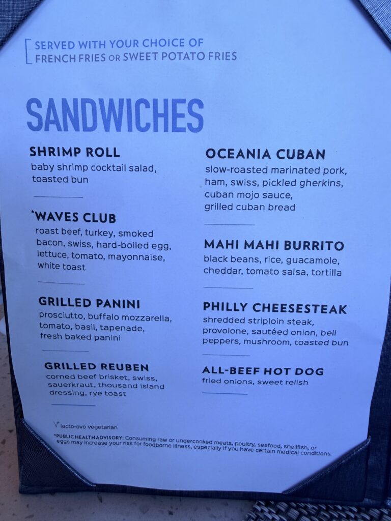 We met back up for lunch which was at The Waves Grill. Below is the menu for The Waves Grill. The special grill for today was fish and shrimp kabobs. Jackie had a club sandwich and I ate a burger. I am not sure what the dessert was that she got from the cafeteria, but something lemon. I have had a hot dog and the Philly Cheesesteak here for lunch thus far and both were great.