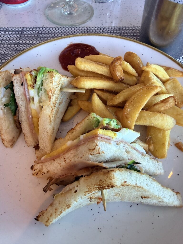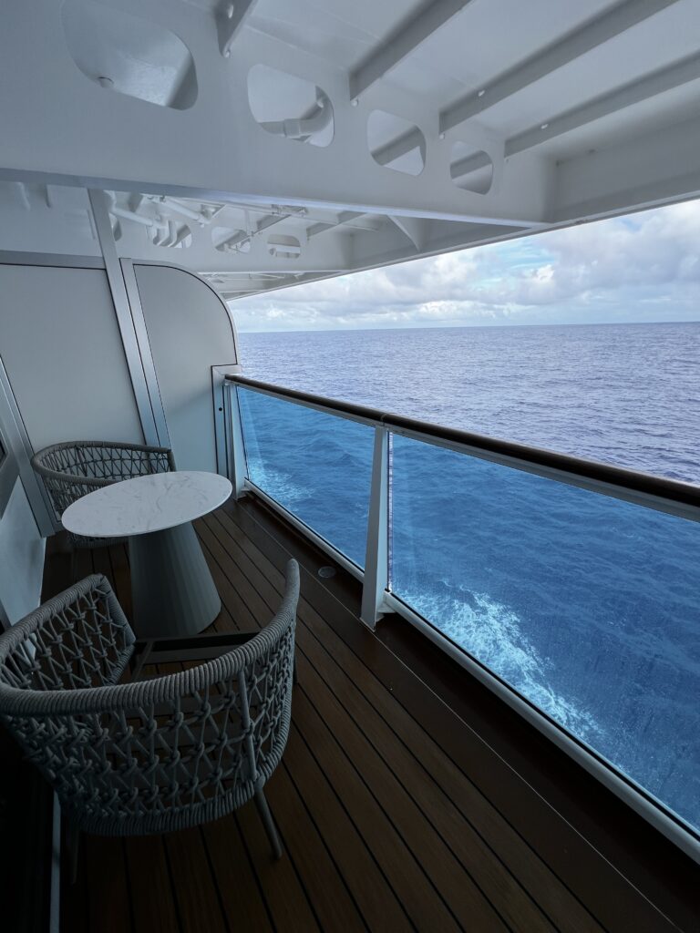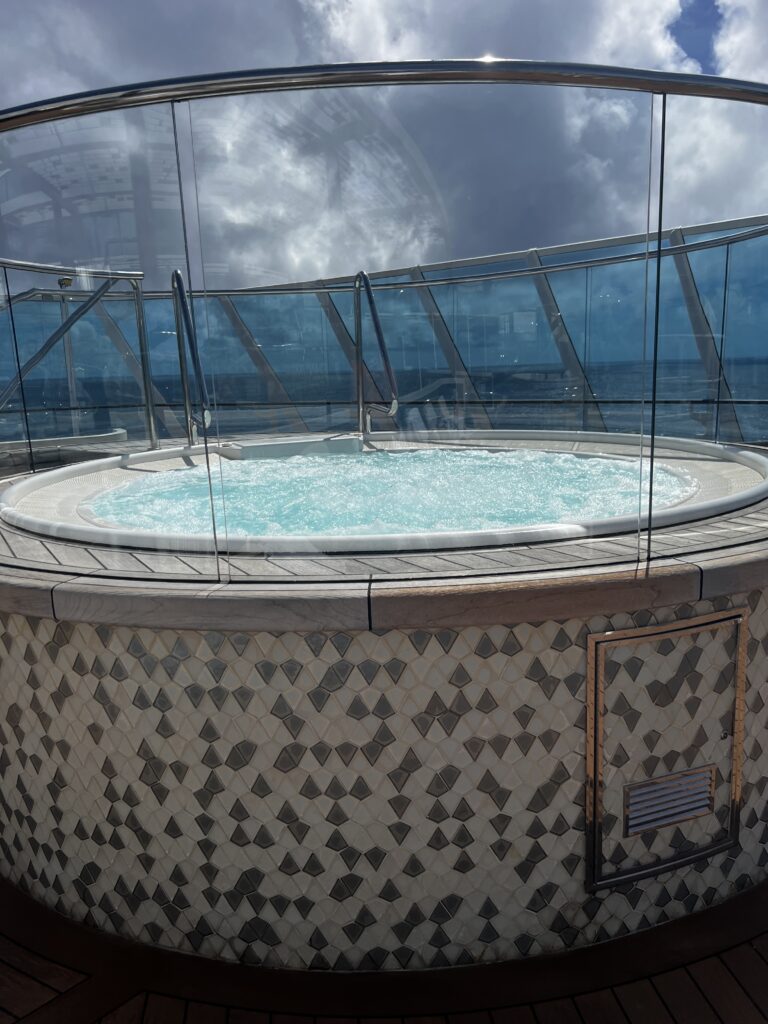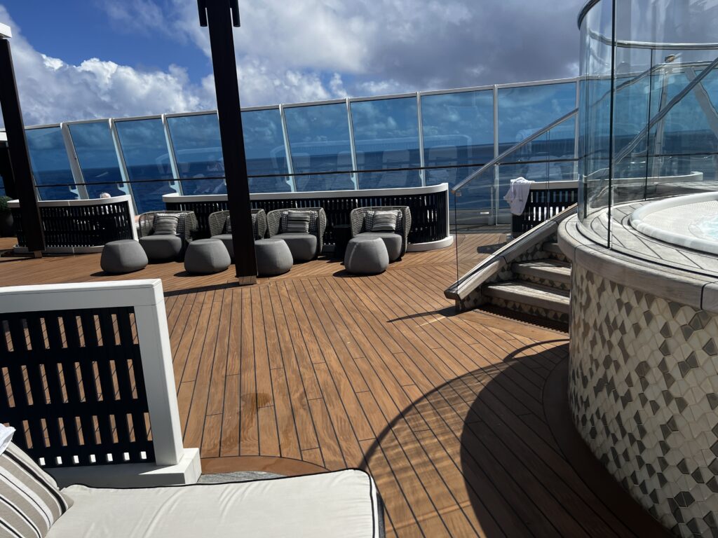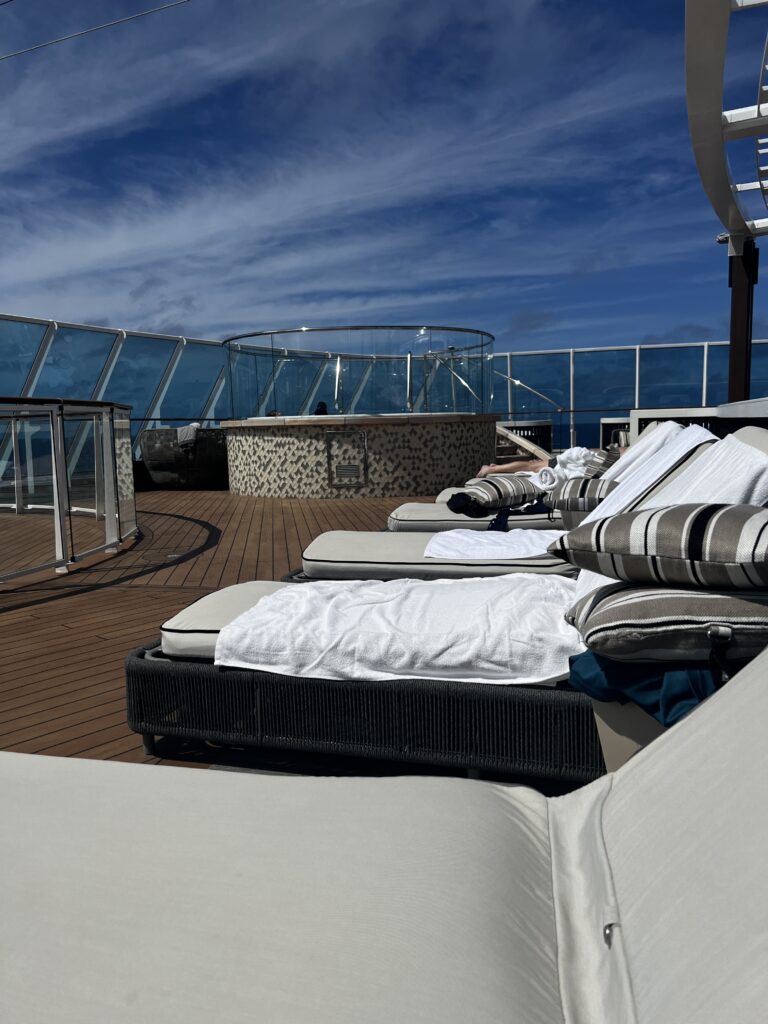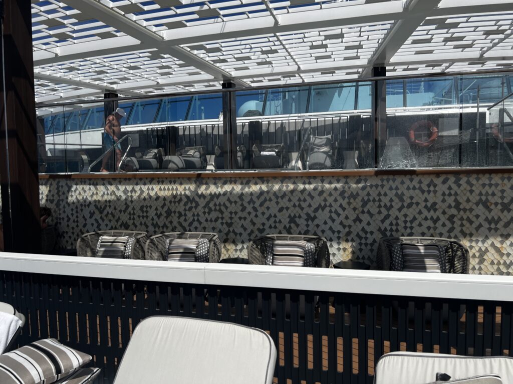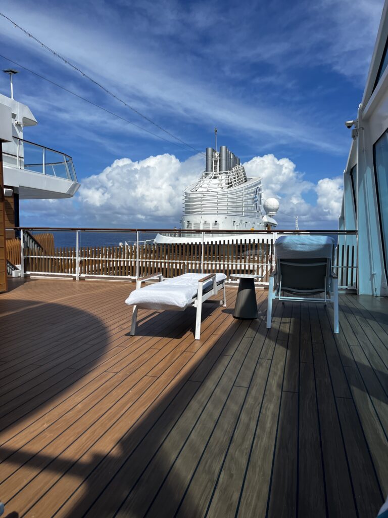 After lunch we decided to go up to the Spa area in the front of the ship and lay out for a little while. And I mean for a little while as the sun was nice and hot today. Only after about 15-20 minutes we decided to find some shade and we found a nice spot in the corner of deck 14 where Jackie read and I slept for about 30 minutes. Maybe I should go find a book, but I still have 115 days to go….laughing. Here a few photos of the spa area that we can hang out in for the cruise. I will take better photos during the trip. The last photo here is from the area we found out of the sun and very quiet.