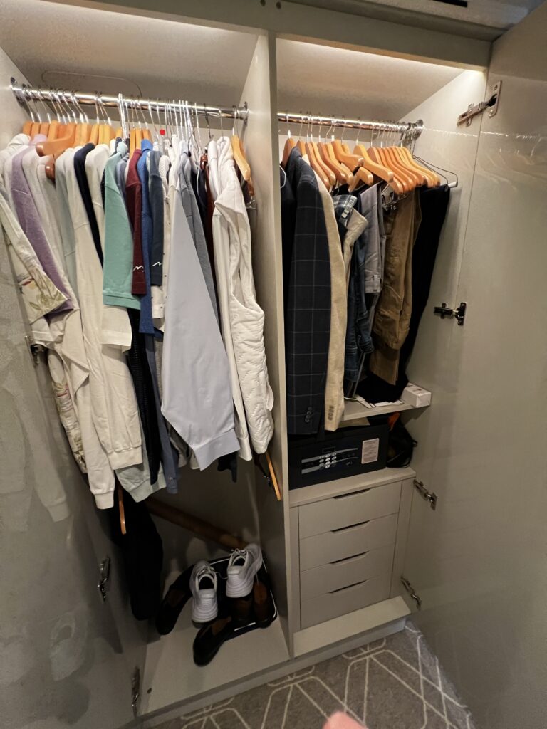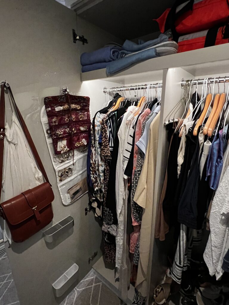 To the right of the entrance are two closets with a dressing mirror in the middle of the closets. The closets are able to hold our hanging clothes along with a hanging bag Jackie put for jewelry, my neckties and our shoes. The cabinets are being used to store our electronics and cameras.