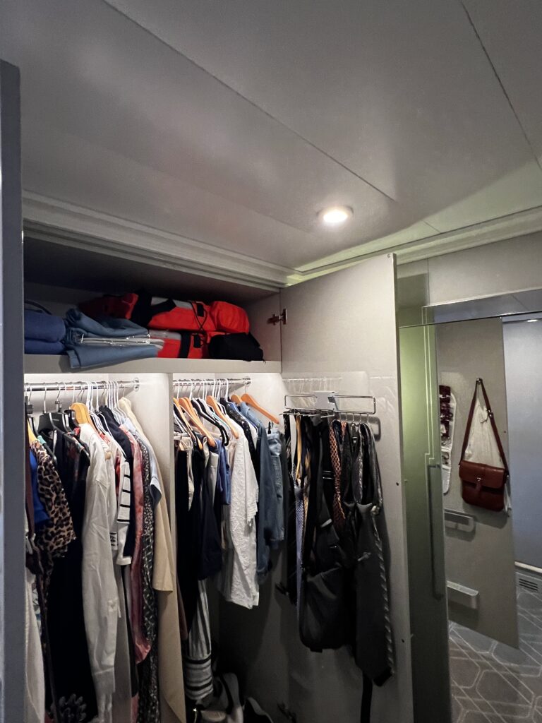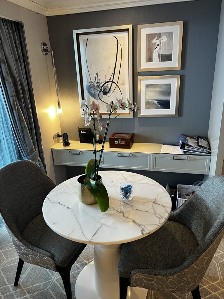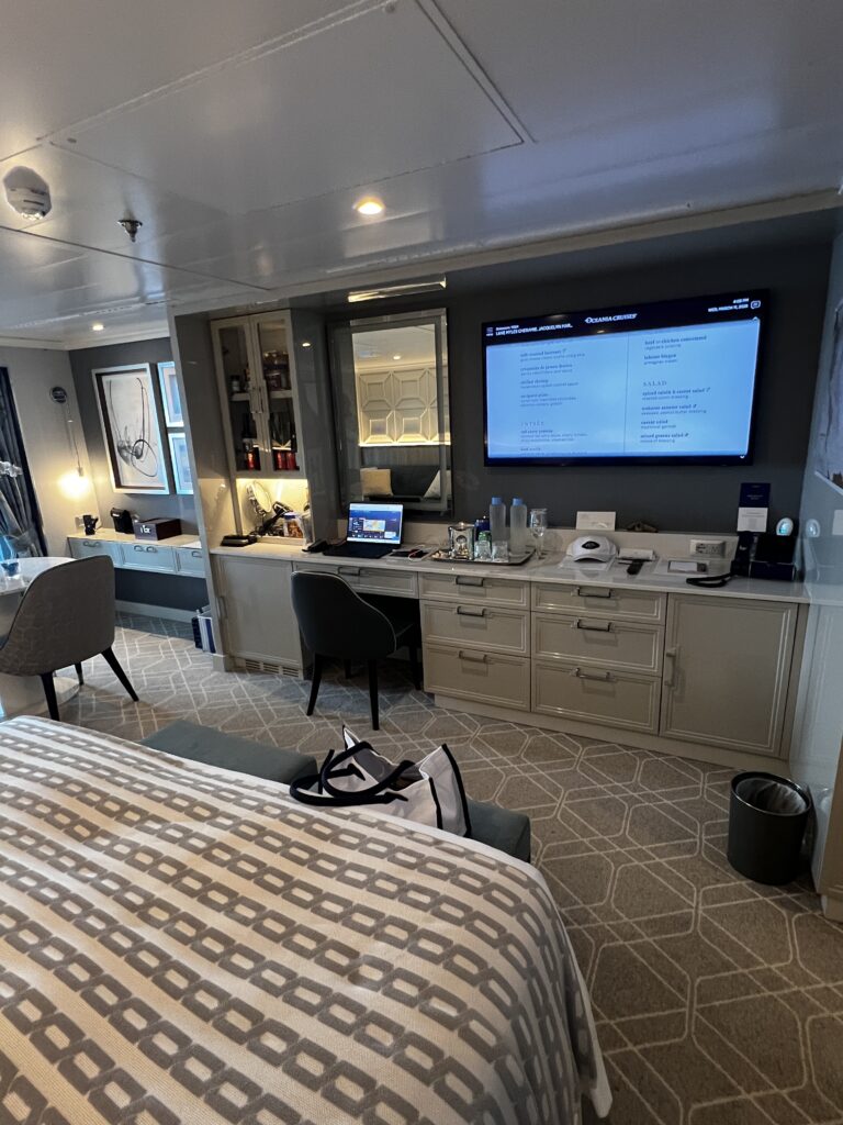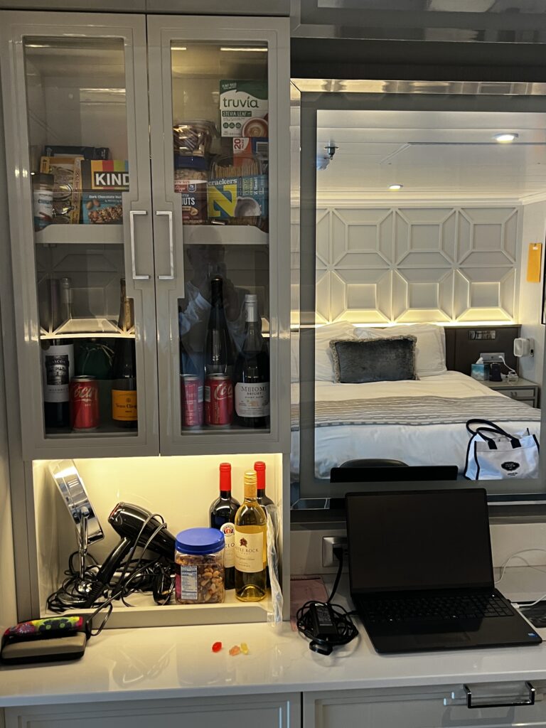 A dining table in the cabin and in the background is my humidor. To the right are binders we brought for this trip to carry excursion papers, copies of passports and visas, flights and hotel reservations we made during the trip. For some reason the middle drawer does not open, so we are thinking just a fake drawer. We would ask the butler, but he has been AWOL. 🙂