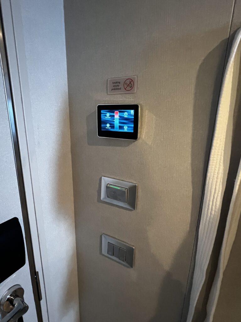 Here are photos of our cabin. I took a video but because of the Wifi problems on board it is impossible to upload videos. We are staying in a Penthouse Suite 11024 which measures 440 square feet. It has good closet and cabinet space which is very much needed with the amount of clothes and other things we brought. View of the cabin when we walk in. Tell Madonna at Jules Cleaners that her calendar is cruising around the world. At the entrance to the cabin on the left wall as you walk in is an electronic panel where you can control the cabin temperature and also can inform the housekeeping staff when you wish to have your cabin cleaned, notify them if you are in the cabin and also there is a selection for Do Not Disturb.