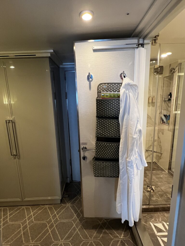 We were able to hang an organizer on the inside of the shower door using magnetic hooks. Also, we brought a folding hamper which works great. In Honolulu we ordered on Amazon a magnetic shelf to hang near the toilet. The bathroom is a nice size. My only suggestion would have been one lavatory instead of two which would have provided more countertop space and one additional drawer under the countertop. The cabinets are a nice size as i the medicine cabinet in the middle.