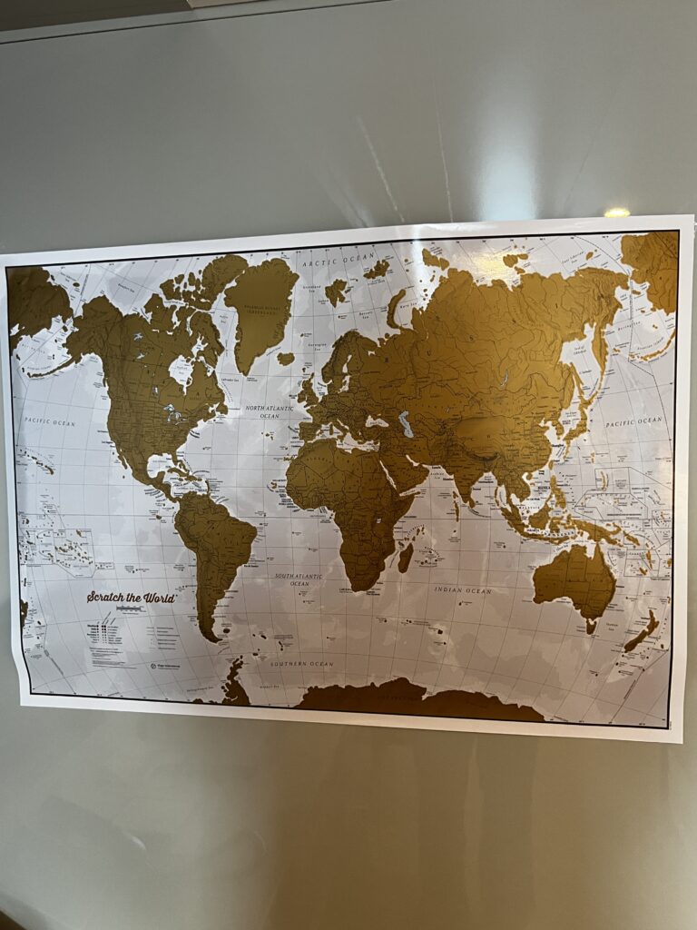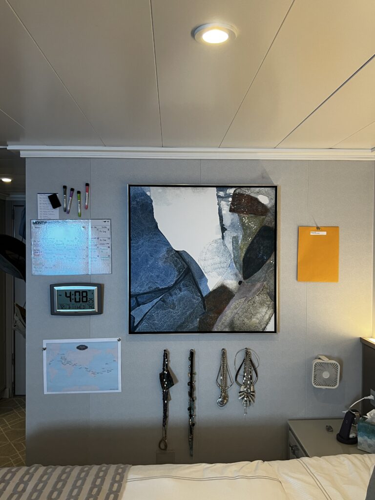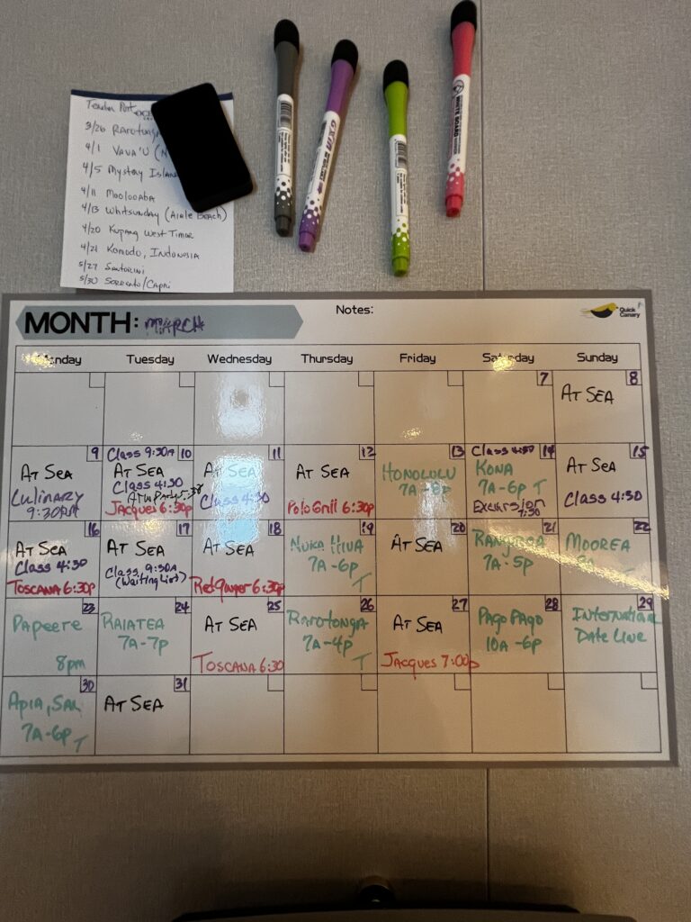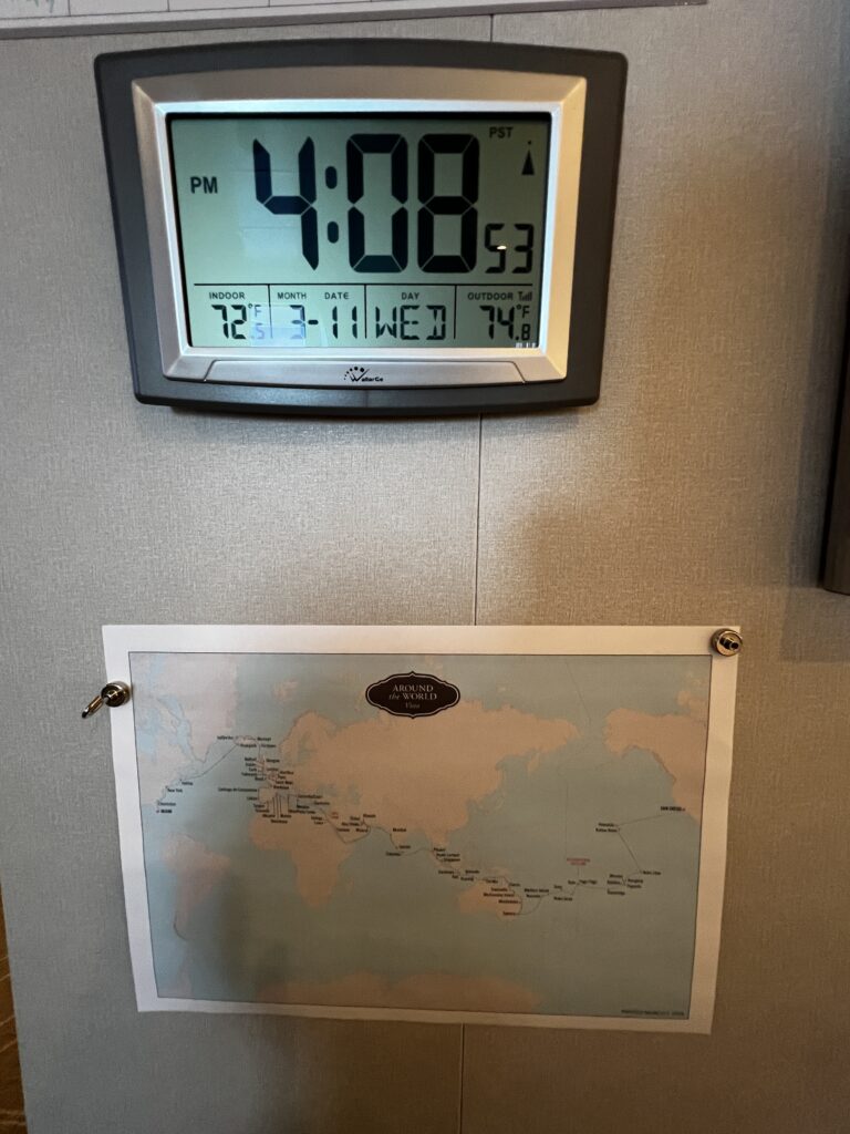 On the wall next to the bed is our communications wall. The first photo shows the wall which is magnetic, so we use hooks to hang a magnetic calendar, a clock, our cruise map and an envelope holding for now our Moorea excursion. The second photo shows our monthly calendar that we filled out for March indicating if at sea or the port we arrive into, if we have something we want to attend like Jackie going to the IT classes, our dinner reservations and a “T” indicating it is a tender port. The third photo was in our Amazon delivery order to the hotel in San Diego. We wanted a wall clock with LARGE numbers for the time along with the day of the week, date and it provides through a sensor I hung outside the temperature outside the cabin and also provides for the temperature inside the cabin. On the opposite wall is a scratch off map that we will use to scratch off ports that we visit. After this cruise we will then scratch off the other locations we have visited.